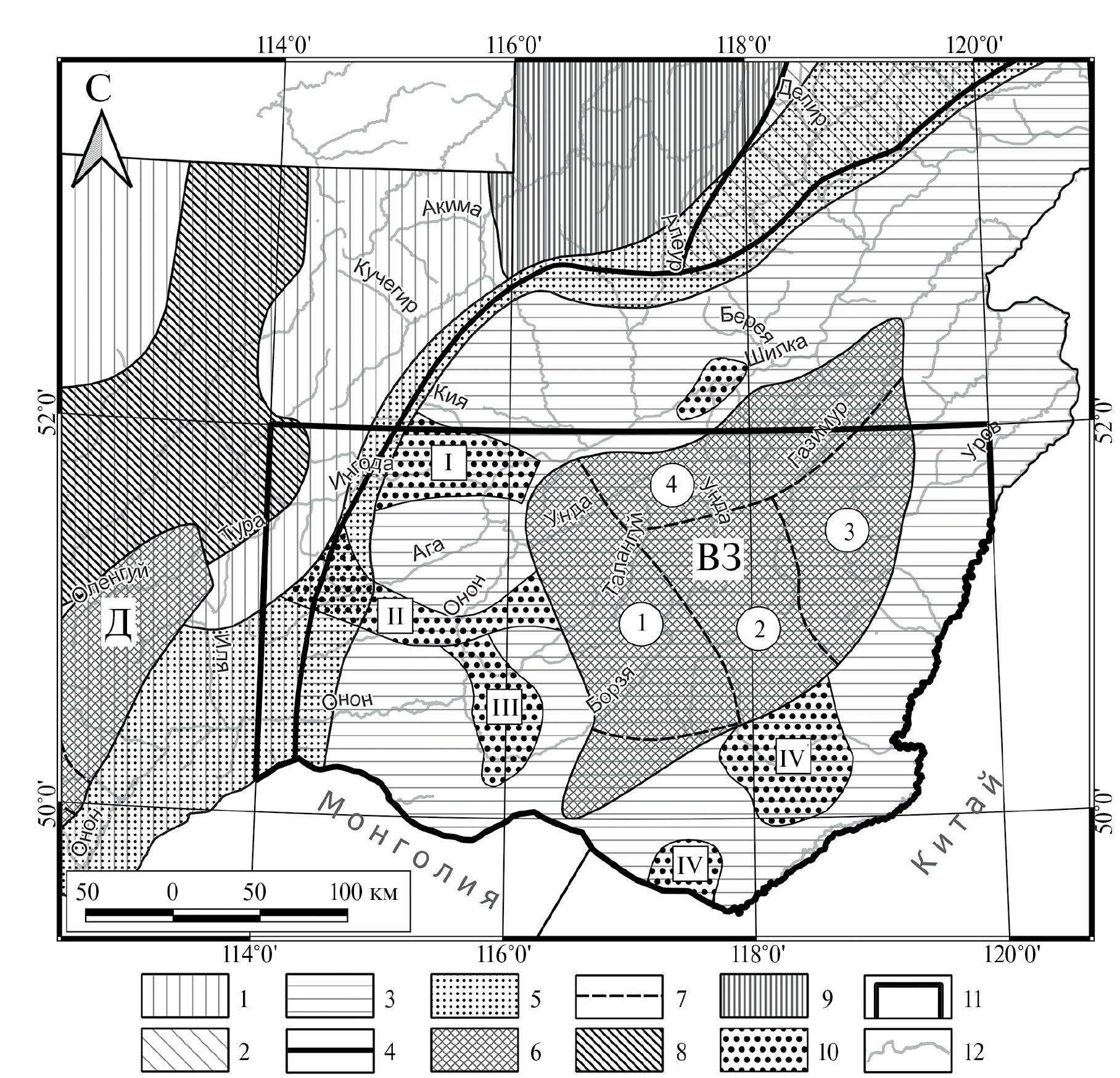 Фиг. 3. Схема структурного районирования раннедокембрийского кристаллического фундамента земной коры юго-восточного Забайкалья (на уровне 5 км среза) (Духовский и др., 1998; Государственная …, 2010): 1–3 – мегаблоки и звенья: 1 – Забайкальское звено Байкало-Станового мегаблока с глубиной залегания подошвы гнейсогранитного комплекса 8–14 км; 2 – Алдано-Становое звено Байкало-Станового мегаблока с глубиной залегания подошвы гнейсогранитного комплекса 6–8 км; 3 – Аргуно-Верхнеамурский мегаблок с ограниченным развитием гнейсогранитного комплекса; 4 – тектонические границы между блоками и звеньями; 5 – проекция плоскости сместителя разлома, разделяющего мегаблоки на уровне пятикилометрового среза (Монголо-Удский глубинный шов); 6 – ареал-плутоны гранитоидного состава (полихронные очаговые структуры): Д – Даурский с однородным внутренним строением глубоких частей, ВЗ – Восточно-Забайкальский со сложным блоковым строением; 7 – границы блоков Восточно-Забайкальского ареал-плутона: 1 – Кукульбейский, 2 – Верхнегазимурский, 3 – Ундино-Золинский, 4 – Новоширокинский; 8 – Верхнехилокская зона смятия; 9 – Верхнеолекминский блок с повышенной мощностью гнейсогранитового комплекса (до 10.5 км); 10 – очаговые и линейные зоны гранитизации: I – Завитинская, II – Орловско-Оловяннинская, III – Шерловогорская, IV – Заурулюнгуйская; 11 – контур площади листа карты M-50; 12 – реки и их названия.