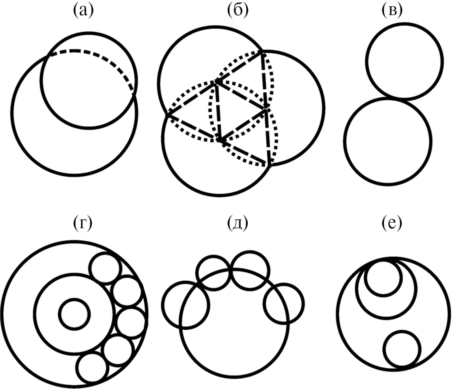 Фиг. 4. Схема пространственных взаимоотношений морфоструктур центрального типа (Гуревич, 2009) с дополнениями авторов: секущее наложение (а), сочленение (тройное) (б), примыкание (в), «подшипник» (г), орбитальные структуры (д), смещение дочерних структур к внешней границе материнской структуры (е).