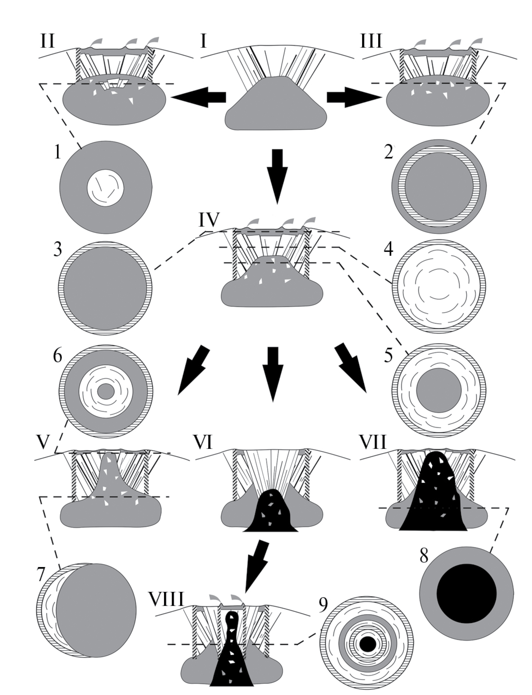 Пример модели последовательной эволюции вулкано-плутонической системы опускания с формированием СЦТ, в зависимости от уровня эрозионного среза, приведено в работе С.Е. Джонсона и др. (Johnson et al., 2002). Развитие системы начинается с образования кольцевых трещин над поднимающимся магматическим очагом с ростом купольной структуры. Затем возможны различные варианты эволюции магматического очага с формированием кольцевых даек и разломов разных рангов с образованием кальдеры. Дальнейшее развитие вулкано-плутонической системы может быть связано с подъемом части магматического очага и формированием новой кальдеры, а также внедрением “вложенной” интрузии. В итоге может сформироваться сложный мультиринговый комплекс с центральной интрузией (фиг. 5). Как известно, локализация и условия отложения рудной минерализации во многом зависят от глубинного уровня действовавшей вулкано-плутонической системы (рудообразующей системы). Разные уровни характеризуются определенным набором рудных элементов или их отсутствием, возможности их обнаружения определяются уже современным уровнем эрозионного среза.