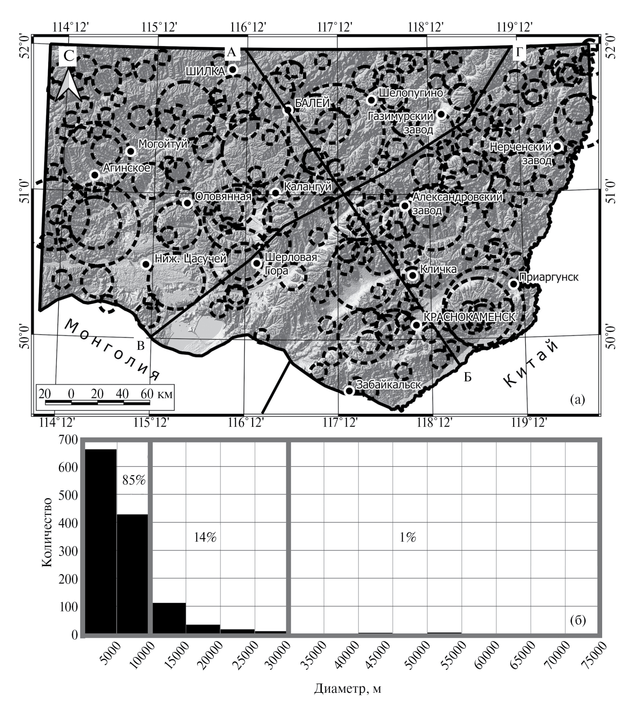 Фиг. 7. (а) – схема структур центрального типа (СЦТ), выделенных по созданной цифровой модели рельефа для листа государственной геологической карты M-50 (показаны структуры более 10 км в диаметре): А–Б, В–Г – линии разрезов; (б) – гистограмма распределения интервалов диаметров всех выделенных СЦТ относительно их количества (15 классов).