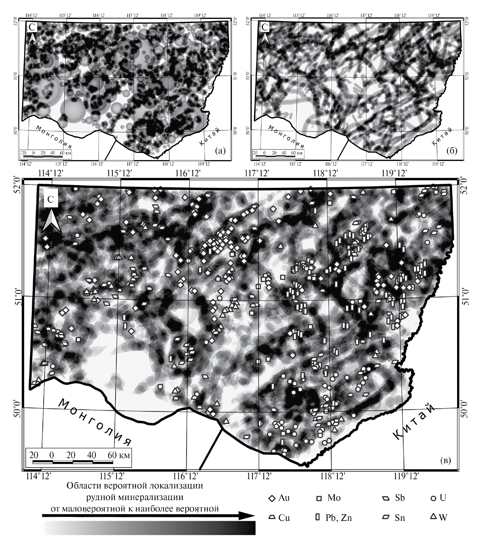 Следующей задачей являлось создание схем относительной удельной плотности известных рудных объектов по типу минерализации с указанием выделенных СЦТ для пространственного анализа с целью выявления связи структур с рудообразующими системами определенных типов. Установлено, что золоторудные объекты локализованы преимущественно в северной (БРП и многочисленные рудопроявления) и северо-восточной частях территории (фиг. 9а); урановорудные большей частью – на юго-востоке (СРП и многочисленные рудопроявления) (фиг. 9б); свинцово-цинковые объекты, крупнейшим из которых является месторождение Нойон-Тологой, а также крупные месторождения комплексных руд (Ново-Широкинское, Бугдаинское) располагаются в восточной части (фиг. 9в); максимумы пространственной плотности меди связаны в основном с небольшими рудопроявлениями, порфировыми и комплексными месторождениями (Ново-Широкинское, Бугдаинское, Быстринское), известными на исследуемой площади (фиг. 9г); сурьма, олово и вольфрам известны повсеместно в пределах территории и локализованы в качестве отдельных рудопроявлений и небольших месторождений (фиг 9д–ж); молибден в основном связан с небольшими рудопроявлениями, является попутным компонентом при извлечении из руд СРП, а также добывался на крупном Шахтаминском месторождении, которое выражено самым большим максимумом пространственной плотности в север-северо-восточной части территории (см. фиг. 9з).