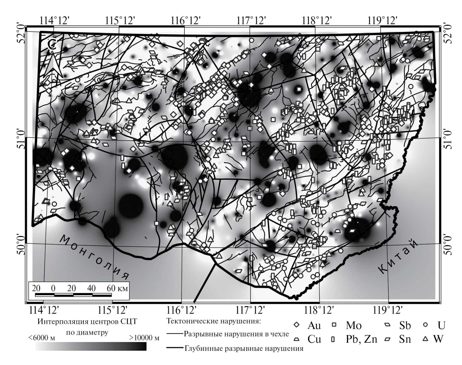 Данные схемы позволили ранжировать выявленные СЦТ по предполагаемому источнику (очагу) в связи с формированием определенного типа полезного ископаемого. Например, самая крупная выделенная нами структура с диаметром 73.4 км, расположенная в северной части рассматриваемой территории, вероятно, маркирует глубинный очаг, связанный с отложением золотой, свинцово-цинковой, медной, сурьмяной, оловянной и молибденовой минерализации. При дальнейшем анализе в зависимости от развития дочерних СЦТ или наложения более поздних структур ниже рангом, являющихся отражением менее глубинных очагов, появляется возможность более точной локализации рудообразующих систем, связанных с определенным типом минерализации. Исходя из этого, как уже отмечалось выше, золотое оруденение относительно рассмотренной структуры локализуется в северо-западной части, вероятно, вследствие сближения и примыкания других СЦТ. Свинцово-цинковая и медная минерализация развиты исключительно в северо-восточной части также в областях сближения и примыкания к данной структуре СЦТ более низких рангов. Сурьма, олово и вольфрам локализуются преимущественно в южной части в местах пересечения внешних кольцевых разломов данной структуры с кольцевыми разломами структур низких рангов. При этом рудопроявления сурьмы присутствуют и во внутренней части структуры, но они также приурочены к области интерференции трех “вложенных” в данную СЦТ структур. Молибденовая минерализация проявлена в западной, южной и, особенно интенсивно, в восточных областях относительно структуры, что также может быть объяснено приуроченностью к периферическим частям вложенных или пересекающих данную структуру СЦТ. Восточнее рассматриваемой структуры, в районе Шахтаминского месторождения, распределение молибдена связано с примыканием и небольшим по площади наложением одноранговых СЦТ, формирующих линейную цепочку.