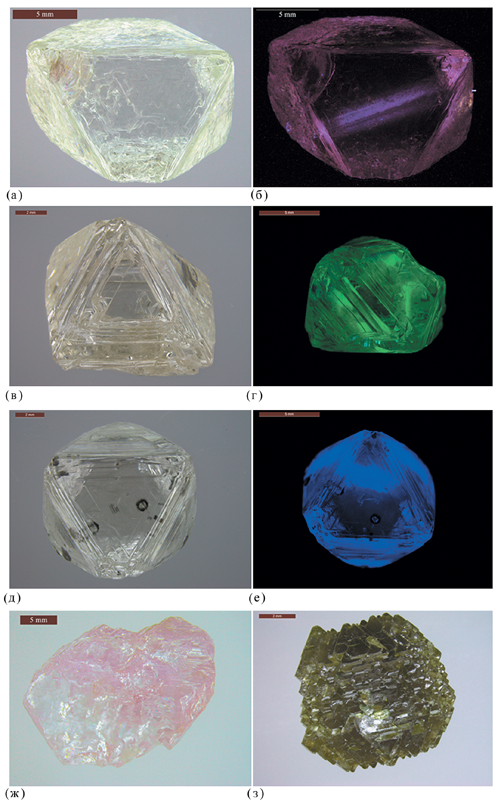 Фиг. 1. Фотографии изученных алмазов (а, б) (цвет ФЛ) – тр. Интернациональная (№242); (в, г) (цвет ФЛ) – тр. Нюрбинская (№167); (д, е) (цвет ФЛ) – тр. Удачная (№79); (ж) – тр. Ботуобинская (№135); (з) – тр. Ботуобинская (№125).