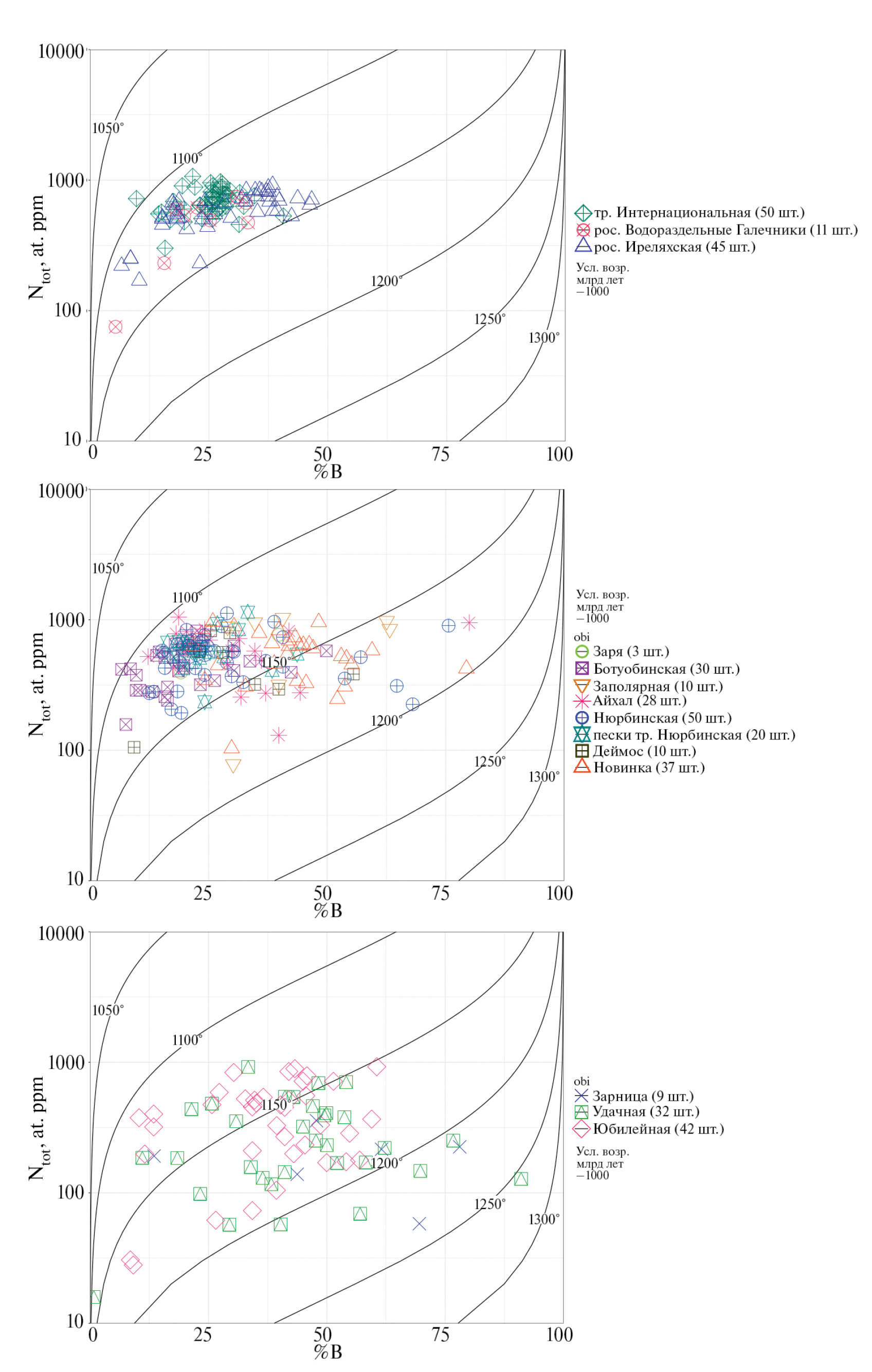 Фиг. 3. Распределение значений концентрации суммарного азота (Ntot) и степени агрегации азота (%В) в крупных алмазах из промышленных месторождений Якутии. Значения нанесены на диаграмму Тейлора (Taylor, 1990). Месторождения сгруппированы по трем диаграммам с учетом вариации примеси азота (от узкой до широкой).