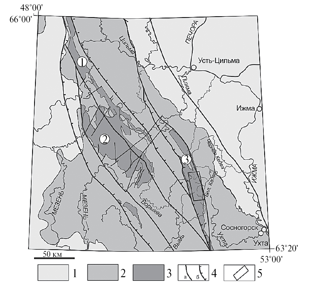 Фиг. 1. Схема расположения поднятий рифейского фундамента Среднего Тимана. 1 – мезозойские отложения; 2 – палеозойские отложения; 3 – породы рифея; 4 – разрывные нарушения: а – разломы, б – надвиги; 5 – Кыввожский район. Цифрами обозначены поднятия: 1 – Цилемское; 2 – Четласское, 3 – Вольско-Вымское.