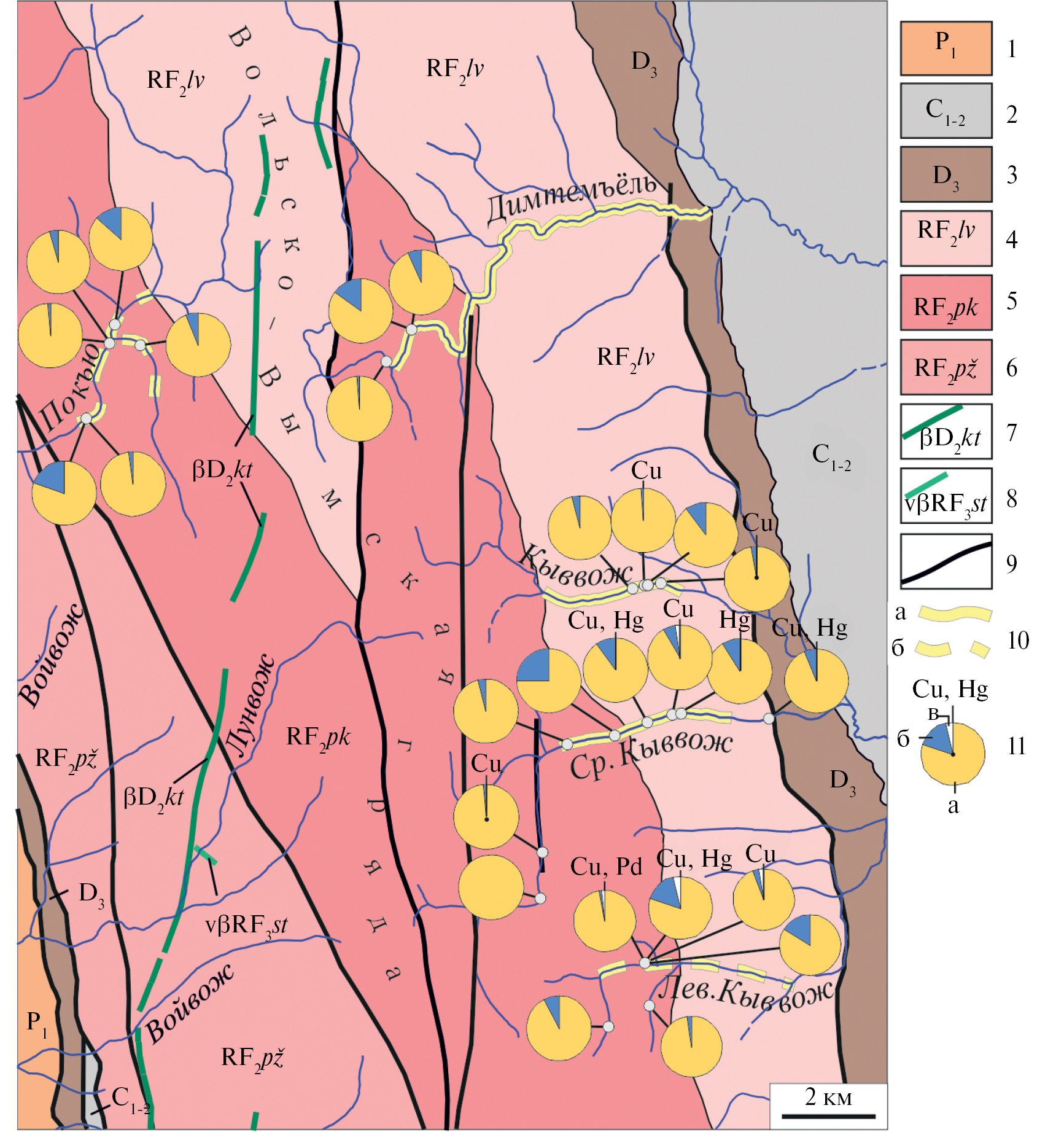 Фиг. 2. Схема геологического строения Кыввожского района (по материалам отчета о результатах работ по объекту “ГДП-200 листов Q-39-XXXV, XXXVI (Кыввожская площадь) ФГБУ “ВСЕГЕИ”, 2020 г., с упрощениями и дополнениями) и особенности состава аллювиального золота. 1 – нижнепермские отложения: глины и алевролиты, мергели, прослои песчаников, известняков, доломиты, известняки; 2 – нижне-среднекаменноугольные отложения: глины, аргиллиты, мергели, известняки, доломиты; 3 – отложения верхнего девона: глины, переслаивание известняков и глин, алевролиты, песчаники, известняки, аргиллиты; 4–6 – среднерифейские отложения: 4 – метапесчаники, переслаивание метапесчаников и метаалевролитов, переслаивание алевросланцев и филлитовидных сланцев лунвожской свиты, 5 – кварцитопесчаники, метапесчаники, метаалевролиты, алевросланцы, сланцы покъюской свиты, 6 – сланцы и метапесчаники пижемской свиты; 7 – дайки долеритов канино-тиманского субвулканического долеритового комплекса; 8 – дайка габбродолеритов среднетиманского габбродолеритового комплекса; 9 – разрывные нарушения; 10 – золотоносные россыпи (а) и россыпепроявления (б), 11 – средний состав золота (мас. %): а – Au, б – Ag, в – другие элементы-примеси (указаны над диаграммой).