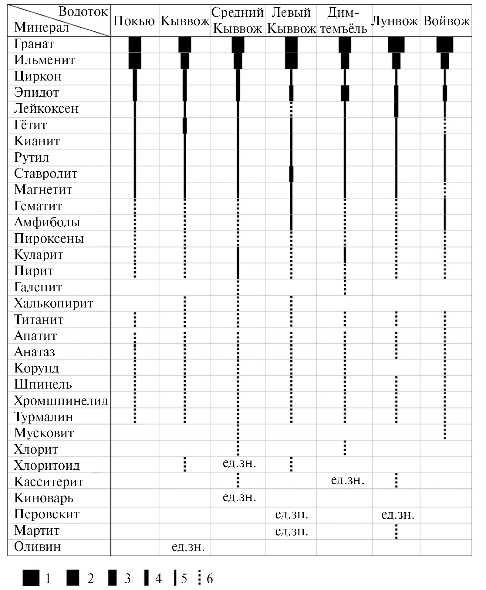 Фиг. 3. Среднее содержание минералов тяжелой фракции из аллювиальных отложений Кыввожского района (отн. ٪): 1 – более 50, 2 – 25–50, 3 – 10–25, 4 – 5–10, 5 – 1–5, 6 – менее 1; ед. зн. – единичные знаки.