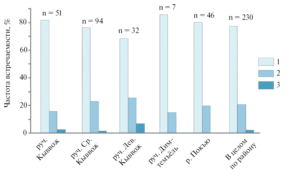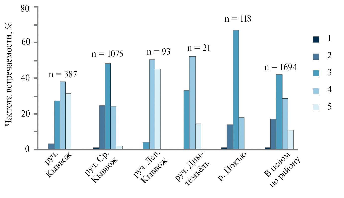 Фиг. 4. Гистограмма встречаемости золота по гранулометрическим классам в Кыввожском районе: 1 – 1.0–2.0 мм, 2 – 0.5–1.0 мм, 3 – 0.25–0.5 мм, 4 – 0.1–0.25 мм, 5 – менее 0.1 мм, n – количество зерен.