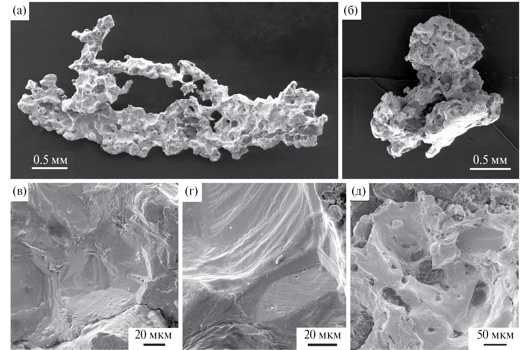 Фиг. 7. Неокатанное золото сложной формы (а, б) и типичный рельеф его поверхности (в, г, д). Изображения во вторичных электронах.