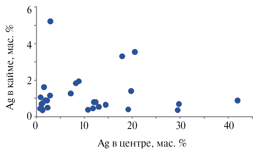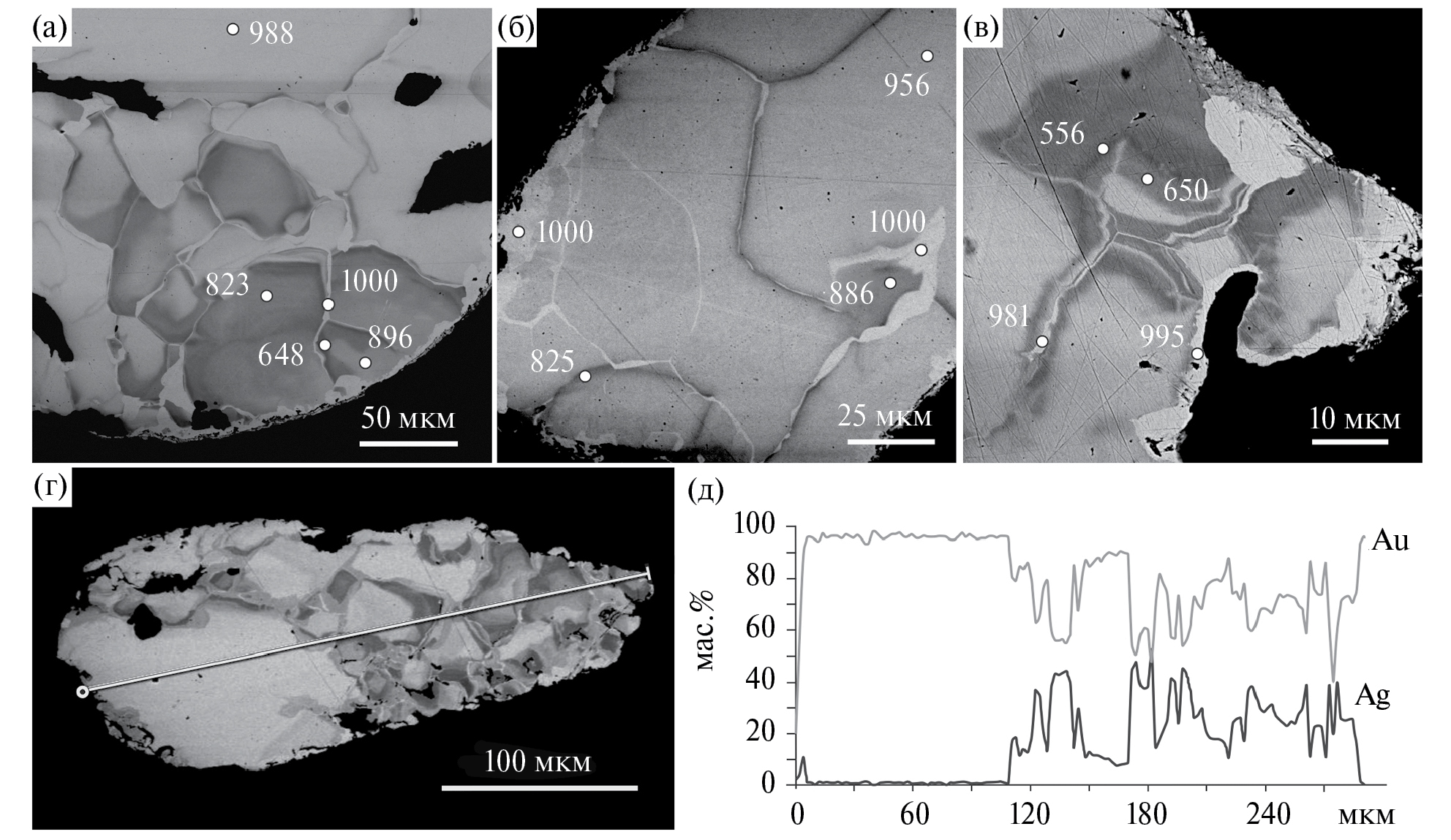 Наличие у большинства частиц золота высокопробных кайм, в том числе широких с полным отсутствием Ag, свидетельствует об их довольно интенсивном преобразовании в зоне гипергенеза, возможно, нахождении в корах химического выветривания. Следует заметить, что природа подобных кайм может быть различной, включая как вынос серебра из приповерхностных участков, так и нарастание нового золота (Николаева, 1978; Мурзин, Малюгин,1987; Николаева, Яблокова, 2007; Осовецкий, 2016; Никифорова и др., 2020; Groen et al., 1990; Chapman et al., 2021; Lalomov et al., 2023). Несмотря на то что границы кайм и центральных частей изученных нами золотин визуально резкие, можно полагать, что важнейшую роль играли все же процессы выноса серебра. Об этом свидетельствует сложная конфигурация границ, подчеркивающая реликтовый характер первичного золота, наличие пор в пределах самих кайм, отсутствие на поверхности частиц золота ростовых форм. Вариации ширины кайм и отсутствие связи между содержанием Ag в кайме и центральной части золотин можно рассматривать как свидетельство того, что гипергенное воздействие на золото было неравномерным. Образование на поверхности частиц золота, находящихся в аллювиальных отложениях, нового золота отмечалось нами лишь в единичных случаях в виде губчатых микроструктур.