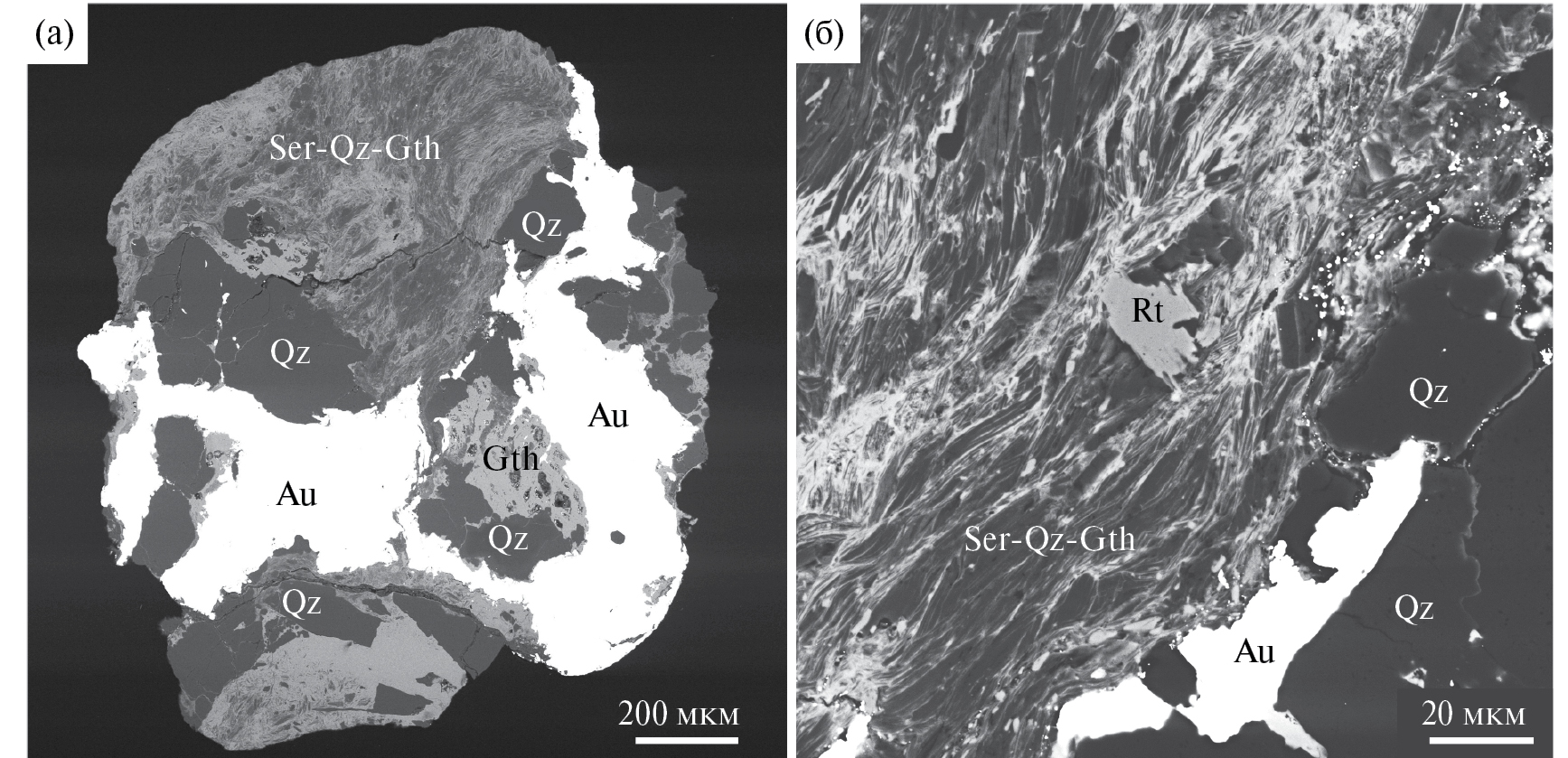 В связи с проблемой коренной золотоносности интересны находки самородного золота в протолочных пробах катаклазированных песчаников на их контакте с серицит-кварц-хлоритовыми сланцами лунвожской свиты на Среднекыввожском участке (Сокерин и др., 2023). Золото представлено мелкими частицами округло-комковатой или сложной формы без следов окатанности. Их строение характеризуется относительно однородной внутренней областью и контрастирующей по составу низкопробной каймой. Содержание серебра во внутренних областях варьирует в узком интервале значений – от 6 до 9 мас.%. От центра к краю золотин наблюдается сначала плавное, затем резкое увеличение концентрации серебра до 10–17 мас.%. На поверхности золотин присутствуют небольшие выделения весьма высокопробного золота толщиной до 5 мкм, которые выглядят как поздняя генерация золота, нарастающая на низкопробные зоны. Присутствие такого золота в пробах песчаников не является результатом попадания в них золота из перекрывающих рыхлых отложений. Его образование, вероятнее всего, обусловлено фильтрацией золотоносных гидротермальных растворов вдоль тектонически нарушенного контакта сланцев и песчаников.