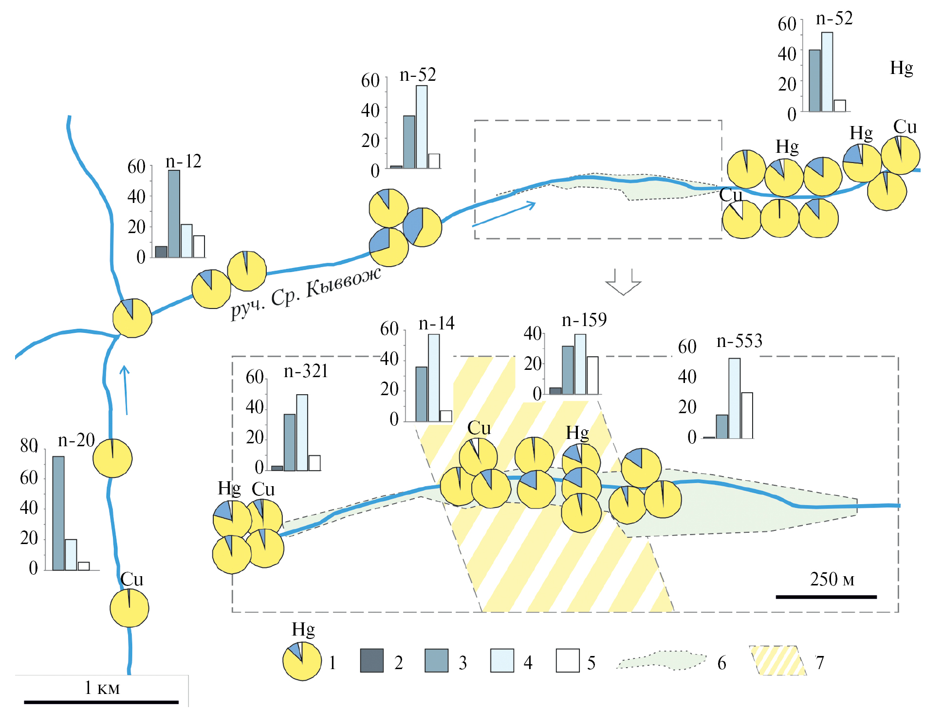 Фиг. 17. Содержание элементов-примесей и степень окатанности золота из аллювиальных отложений Среднекыввожского участка: 1 – диаграмма состава золота: желтый сектор – Au, синий – Ag, белый – другие элементы-примеси (указаны сверху диаграмм); 2–5 – гистограммы степени окатанности золота (%): совершенно окатанное (2), хорошо окатанное (3), полуокатанное (4), слабоокатанное (5); 6 – контур промышленной россыпи (добычной полигон); 7 – потенциально перспективная на золото зона развития сульфидной минерализации.