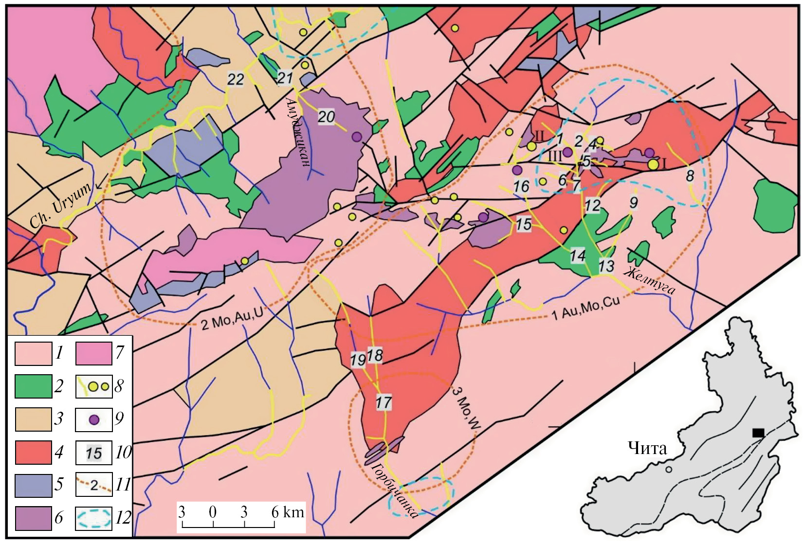 1 – гнейсовидные или порфировидные граниты (Pt1); 2 – габбро-диориты (Pt1); 3 – олекминский? комплекс (Pz1), лейкограниты; 4 – амананский комплекс (J2–3), гранодиориты; 5 – порфириты и их туфы (J2–3); 6 – амуджиканский комплекс (J3), порфировидные граниты, гранодиориты; 7 – нерчуганский комплекс (J3), граносиениты; 8 – россыпи, месторождения (I – Ключевское, II – Александровское) и рудопроявления Au; 9 – месторождения Mo (III – Давендинское); 10 – участки опробования россыпей (табл. 1); 11 – контуры Давенда-Ключевского Au, Mo, Cu (1), Амуджиканского Mo, Au, U (2), Горбичанского Mo, W (3) рудных узлов; 12 – шлиховые ореолы киновари.