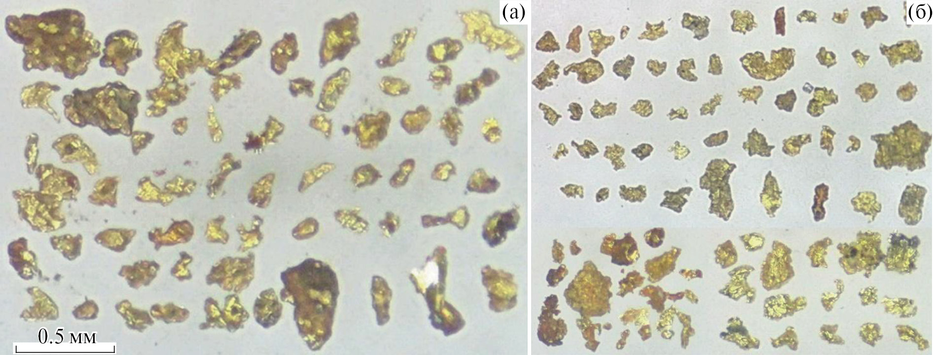 Золото из старых отвалов Ключевского и Давендинского месторождений, морфология которого отображена на фиг. 3, по размеру не превышает 0.5 мм, чаще даже 0.1–0.2 мм, а в шлиховых концентратах осталось не менее тысячи золотин размером 0.1–0.05 мм и меньше. На поверхности многих золотин наблюдаются корки и примазки ржаво-бурого, черного и сероватого цветов. Следует отметить, что золото по морфологии подобное изображенному на фиг. 3, заметно присутствует в пробе из россыпи р. Ключи (8) (см. фиг. 2б).