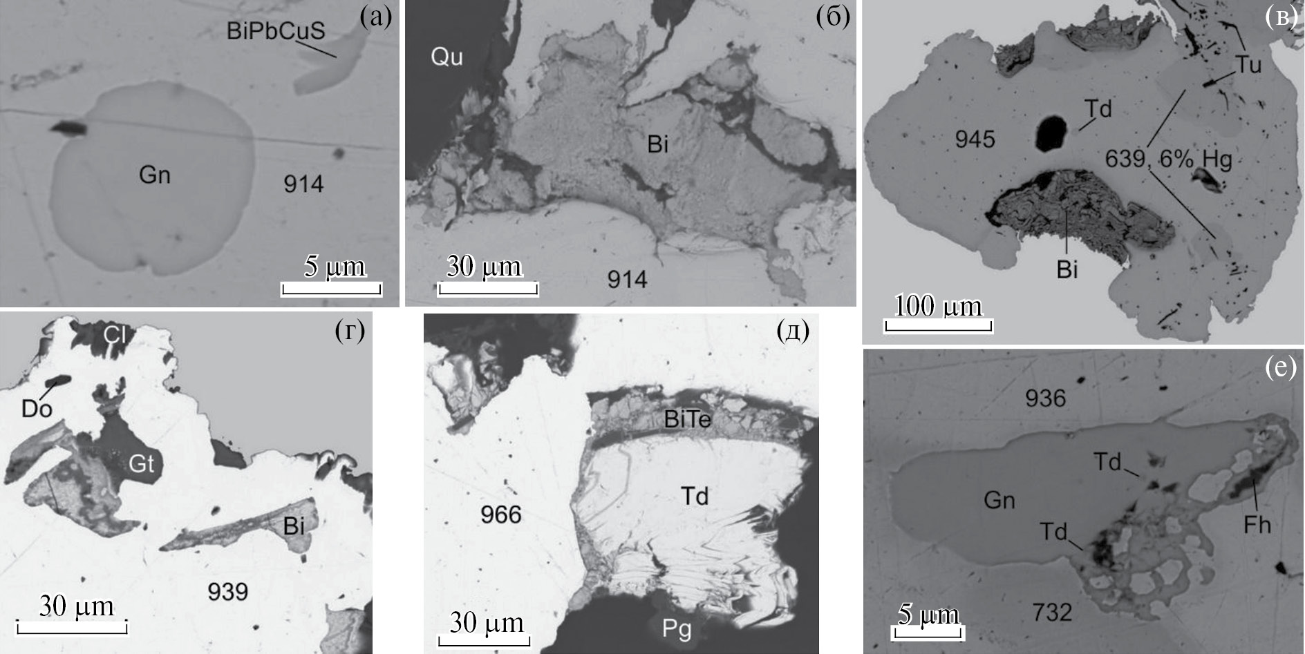 SEM-изображения. Минералы: Gn – галенит, Qu – кварц, Td – тетрадимит, Bi – самородный висмут, Tu – турмалин, Pg – плагиоклаз, Do – доломит, Gt – гетит, Cl – хлорит, Fh – блеклая руда. Цифрами на фотографиях обозначена пробность золота.