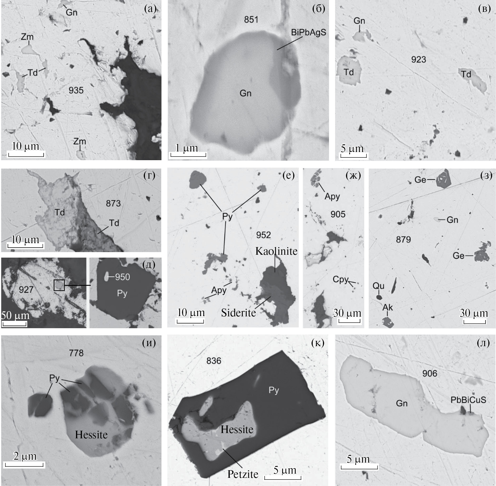 SEM-изображения и фотография под рудным микроскопом. а – проба 4; б – проба 12; в, е–з – проба 9; г, д – проба 8; и–л – проба 18. Минералы: Gn – галенит, Td – тетрадимит, Zm – цумоит, Py – пирит, Apy – арсенопирит, Cpy – халькопирит, Ge – герсдорфит, Ak – аллоклазит, Qu – кварц. Цифрами на фотографиях обозначена пробность золота.
