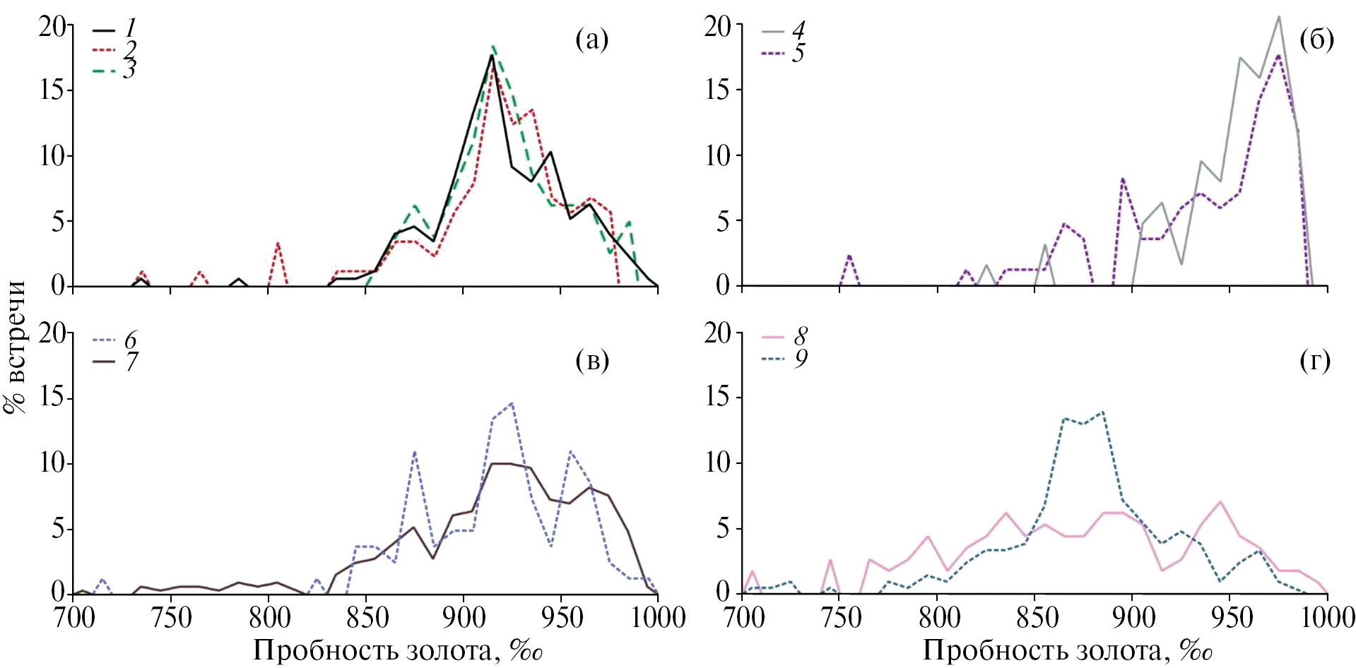 Эндогенные особенности химического состава самородного золота в той или иной степени сохраняются в россыпях и позволяют судить о типе рудной минерализации (Нестеренко, 1991; Morrison et al., 1991; Townley et al., 2003). Изучение химического состава золота из отвалов и россыпей показало, что основной примесью, определяющей пробность Au, является Ag, а пробность “рудного” и россыпного золота хорошо сопоставима. В россыпях бассейна р. Желтуга подавляющее количество золотин имеет пробность выше 850‰, а в отвалах месторождения Давенда – даже выше 900‰. Гистограммы (см. фиг. 4) и детальные, построенные с шагом 10‰ графики пробности Au (фиг. 9), показали, что по этому признаку можно выделить три основные разновидности золота.