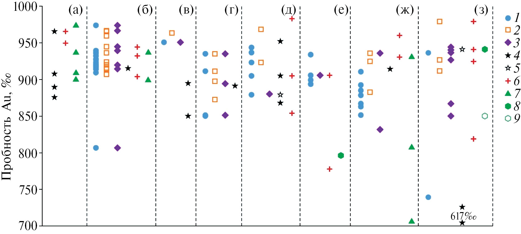 1 – отвалы Ключевского месторождения, n=175; 2 – проба 5, n=89; 3 – проба 9, n=82; 4 – отвалы месторождения Давенда, n=63; 5 – пробы 1, 2, 6, 7, n=85; 6 – пробы 4, 8, 12, n=84; 7 – россыпи бассейна р. Желтуга, без проб 4, 8, 12, n=338; 8 – пробы 17–19, n=113; 9 – пробы 20, 21, n=208.