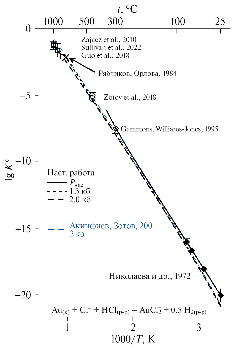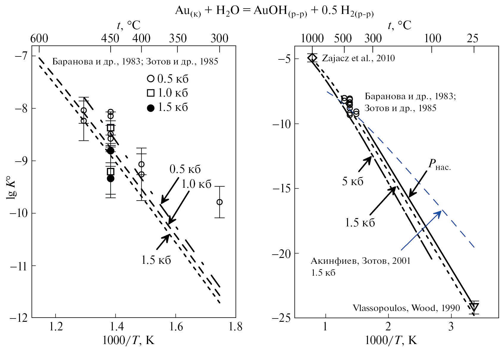 Данные по устойчивости гидроксокомплекса AuOH(р-р) при стандартных условиях 25 °С, 1 бар ограничиваются одной работой (Vlassopoulos, Wood, 1990). Авторы измерили растворимость порошка Au в растворах NaOH (рН 10.5–12.7). По окончании опытов в растворах измерялись величины pH и Eh и отбирались пробы для определения Au. Результаты опытов интерпретированы с расчетом константы реакции Au(к) + 2H2O(ж) = AuOH(H2O) + H+ + e-. Авторы работ (Баранова и др., 1983) и (Зотов и др., 1985) определили растворимость Au в воде при 300–500 °С, 500, 1000 и 1500 бар. Использовалась автоклавная методика с определением концентрации металла после закалки опыта. Окислительный потенциал системы задавался буферными парами Ni–NiO и Fe3O4–Fe2O3. Кроме того, два опыта в работе (Баранова и др., 1983) выполнены с введением в систему навесок Fe и Al, которые реагируют с водой с образованием водорода. В работе (Stefánsson, Seward, 20032) измерена растворимость Au в воде и растворах NaOH (до 0.5 m, моль·(кг Н2О)-1) при 300–600 °С и давлении 500–1500 бар. В опытах использовался проточный гидротермальный реактор. Раствор, подаваемый в реактор, барботировался смесью газов H2 – Ar. На выходе из реактора отбирались пробы для определения содержания Au и H2. Содержание растворенного H2 менялось в пределах 4·10-6–4·10-4 m. Авторы работы установили, что во всей изученной области PTx параметров доминирующей формой Au является AuOH(р-р), и определили константы устойчивости этого комплекса. В работе (Zajacz et al., 2010) измерена растворимость Au в растворах NaCl, HCl и HCl+NaCl при 1000 °С, 1500 бар. Использовался метод искусственных флюидных включений в кварце, которые захватывали экспериментальный флюид при параметрах опыта. Определение золота выполнялось методом масс-спектрометрии с индуктивно-связанной плазмой и лазерным пробоотбором ЛА-ИСП-МС. Водород вводился в систему в виде смеси H2–Ar. Давление H2 при параметрах опыта оценено в 19 бар. Часть опытов выполнена с введением в систему навески серы. Ввиду отсутствия надежных значений термодинамических свойств серусодержащих частиц при высоких PT-параметрах эти данные в нашей работе не использованы. Экспериментальные данные (Zajacz et al., 2010) обработаны с одновременным расчетом значений энергии Гиббса AuOH(р-р) и AuCl2-.
