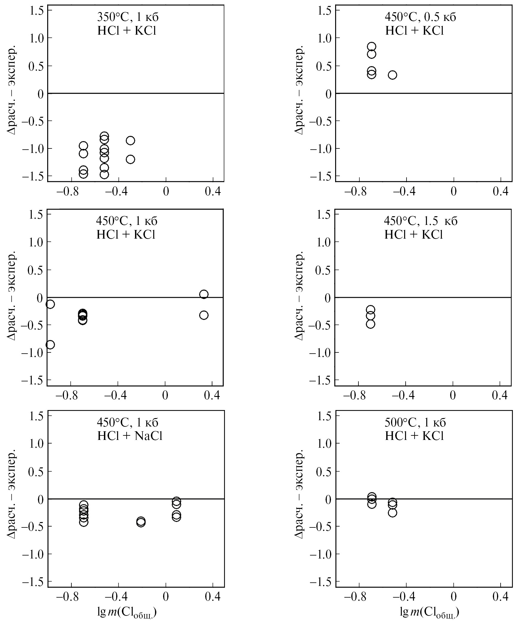 В целом бóльшая часть точек, использованных при расчете параметров модели HKF, описывается с погрешностью, близкой к экспериментальной (фиг. 1 – AuOH(р-р), фиг. 2 – AuCl2–). В опытах (Hurtig, Williams-Jones, 2014) по изучению растворимости Au в растворах HCl с образованием нейтрального хлоридного комплекса окислительный потенциал задавался парой MoO2 – MoO3. Использование данных (Hurtig, Williams-Jones, 2014) приводит к сильно завышенным константам устойчивости AuCl(р-р). Мы полагаем, это связано с проблемой в контроле редокс-состояния экспериментальной системы.