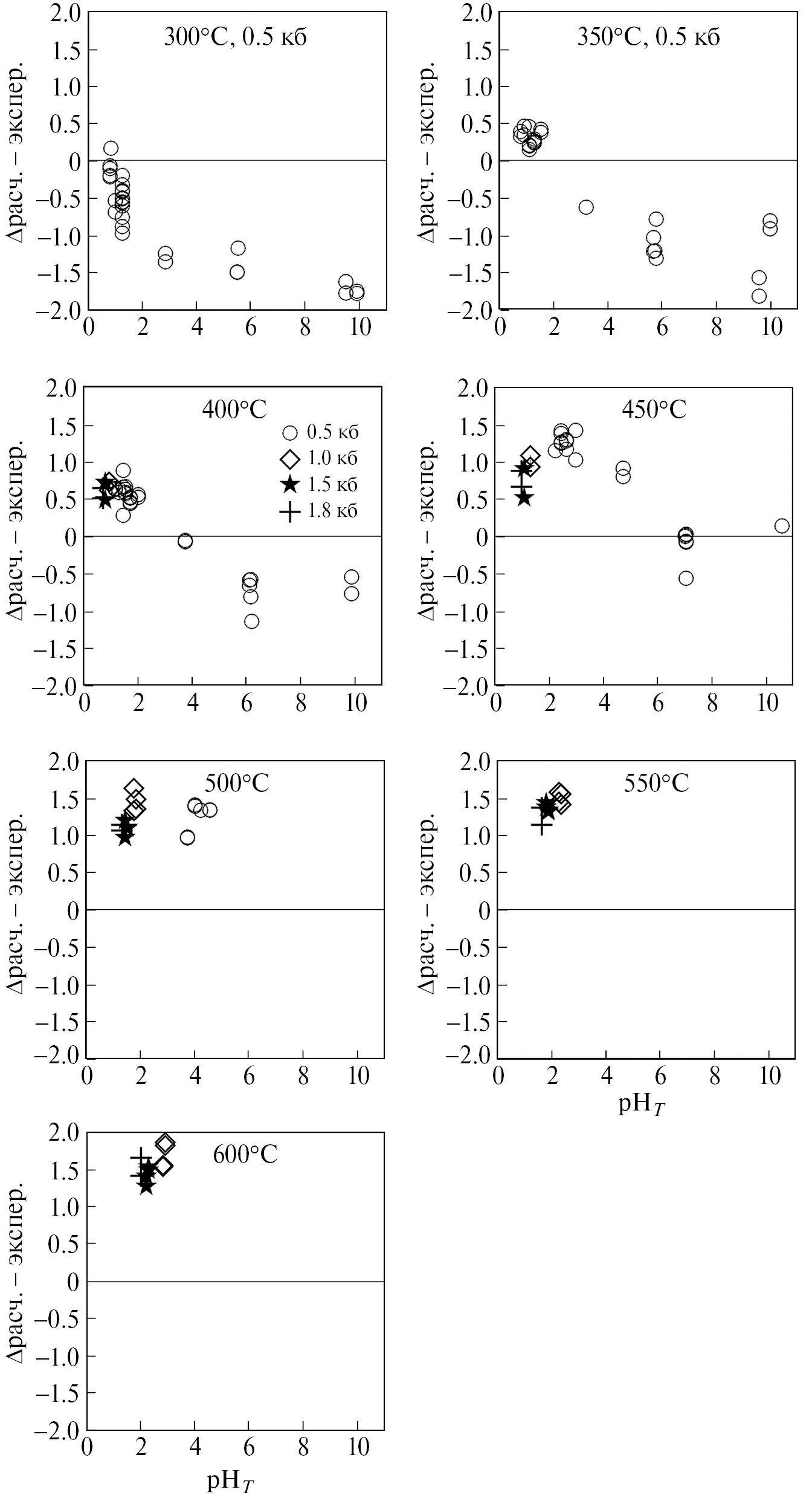 Фиг. 4. Сравнение растворимости Au по данным (Stefánsson, Seward, 20031) с расчетом по модели HKF (настоящая работа, табл. 1). Ось ординат – отклонение результатов расчета от эксперимента, логарифмическая шкала.