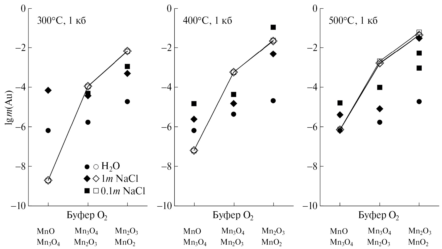В работе (Likhoidov et al., 2000) растворимость Au измерялась в воде, 1m NaCl и 0.1 m HCl при 300–500 °С, P=1 кбар. Летучесть кислорода задавалась буферными парами, состоящими из оксидов Mn. Как показывает расчет (полые символы и линии на фиг. 6), во всех случаях основной формой растворенного Au является гидроксокомплекс AuOH(p-p). Поэтому рассчитанная растворимость слабо зависит от состава флюида. Вместе с тем измеренная растворимость Au сильно зависит от концентрации хлоридов, в то время как зависимость от состава буферных пар (или f(O2)) слабее полученной в расчетах. Эти отклонения можно связать как с неравновесным составом сложной экспериментальной системы, так и с погрешностью эксперимента. В частности, опыты проводились с использованием золотых ампул. Смыв со стенок ампул не проводился из-за вероятности загрязнения пробы золотом. Это могло привести к занижению экспериментальных данных относительно расчета. Дополнительным источником погрешности в работах (Henley, 1973; Likhoidov et al., 2000) может служить отсутствие надежных данных для гидроксо- и хлоридных комплексов Fe и Mn, которые сильно влияют на состав экспериментальных флюидов. По перечисленным выше причинам мы не использовали результаты этих работ для построения термодинамический модели комплексообразования Au.