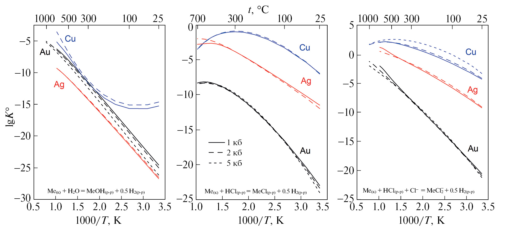 На фиг. 7 сравниваются константы образования комплексов Сu, Ag и Au при разных температурах. Гидроксокомплексы Au и Ag ведут себя схожим образом, константа их образования растет по мере увеличения температуры. Для меди наблюдается минимум в районе 75 °С. Вероятно, наличие минимума связано с особенностями описания гидратированной частицы уравнением AD (Акинфиев, Зотов, 2023). Такое поведение не характерно для нейтральных комплексов и нуждается в проверке. Температурный ход констант образования хлоридных комплексов (MeCl(р-р), MeCl2–) закономерно меняется в ряду Au – Ag – Cu. Несмотря на то, что минимальные значения констант образования наблюдаются у Au, рост значений констант с температурой для комплексов Au выражен сильнее, чем у Ag и Cu. В результате такого поведения в области температур около 1000 °С разница в константе образования второго хлоридного комплекса Cu и Au составляет 3 л.е. Таким образом, рост температуры нивелирует разницу в поведении металлов; можно условно сказать, что золото становится менее “благородным” металлом.