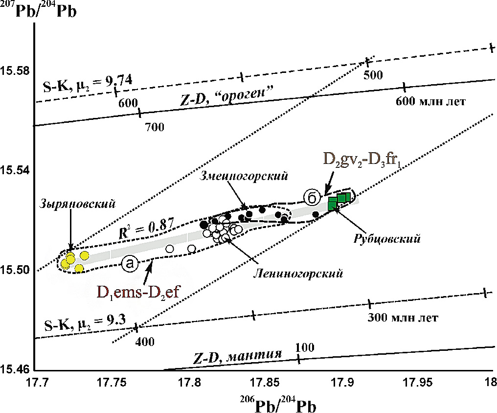 Змеиногорско-Зыряновская металлогеническая подзона отвечает восточному сегменту Рудноалтайской зоны. Наши ранние исследования, начатые в советские годы (1982 г.) и с перерывами продолжающиеся до настоящего времени, в основном проводились в центральном и южном секторах подзоны, отвечающих Лениногорскому и Зыряновскому рудным районам соответственно; основные результаты были обобщены в монографии (Викентьев, 2004). Здесь крупнейшие в регионе и при этом многочисленные колчеданно-полиметаллические месторождения приурочены к Синюшинскому и Ревнюшинскому поднятиям и сопряженному с первым Белоубинскому прогибу и связаны с образованиями базальт-риолитовой формации эмс-живетского возраста, в составе которой кислые эффузивы слагают 15‒45% от общего объема пород и до 70% объема вулканитов, а основные им подчинены (5–15% общего объема). В постсоветские годы больше внимания авторами было уделено российской части Рудного Алтая – его северо-западной части, включающей Золотушинский, Змеиногорский и Рубцовский рудные районы (Куйбида и др., 2013, 2015, 2019; Kuibida et al., 2020; Чернышев и др., 2023). Циклы рудоносного контрастного по составу вулканизма охватывают здесь более широкий возрастной диапазон – с начала эйфеля до конца франа.