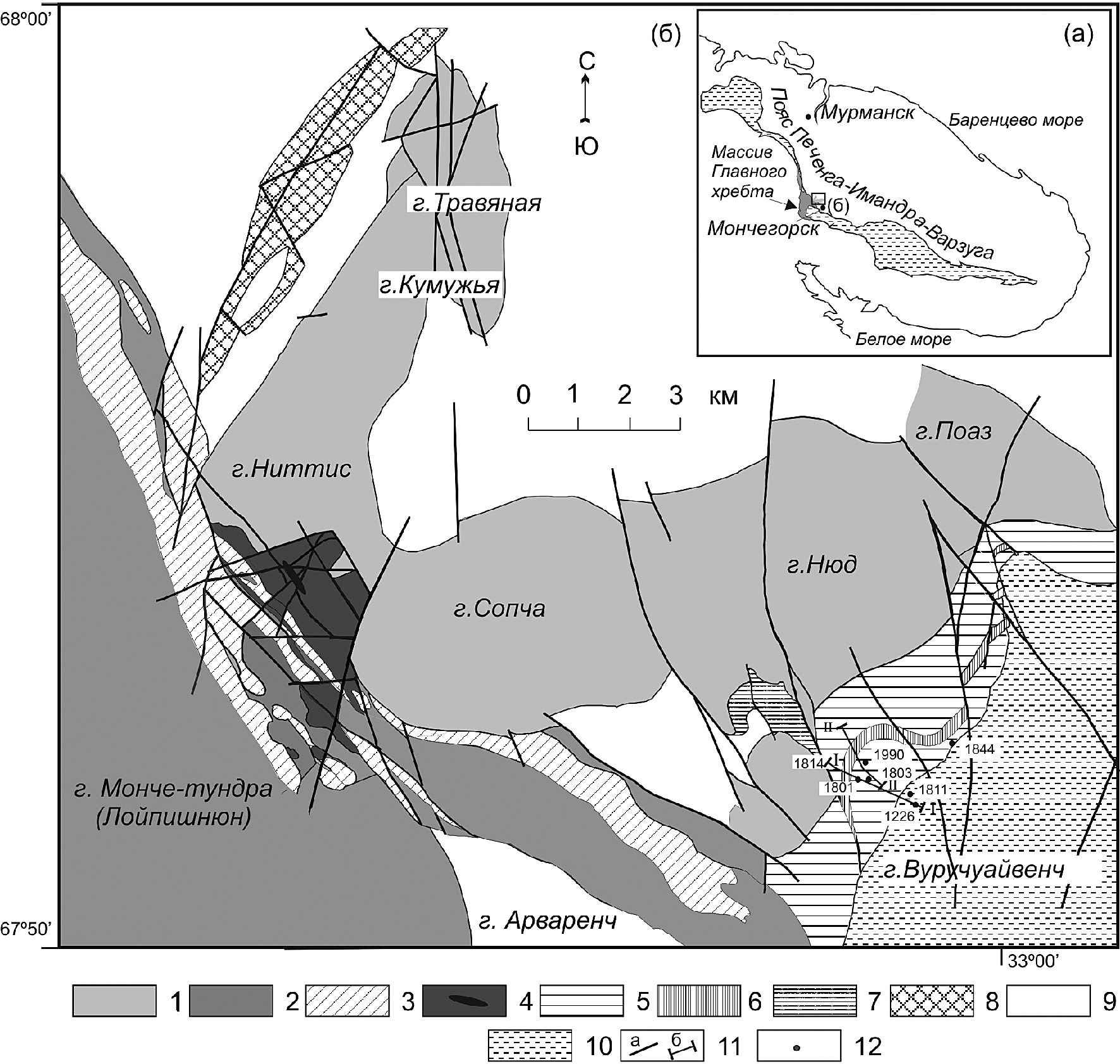 Фиг. 1. Местонахождение (а) и схематическая геологическая карта (б) Мончегорского интрузивного комплекса: 1 – породы Мончегорского плутона; 2, 3 – интрузия Мончетундра: крупнозернистое амфиболизированное габбро и габбронорит (2), ритмично-расслоенные породы (габбронорит, норит, пироксенит, перидотит, дунит) (3), дуниты, перидотиты и хромититы Дунитового блока (4); 5, 6 – интрузия Вуручуайвенч: породы расслоенной серии (5), ЭПГ риф (6); 7 – породы интрузии Габбро 10 аномалии; 8 – габбронориты интрузии Кириха; 9 – архейские гранат-биотитовые и амфиболовые гнейсы, диорито-гнейсы; 10 – вулканогенно-осадочные породы серии Печенга–Имандра–Варзуга; 11 – тектонические нарушения (а), расположение геологического разреза (б); 12 – местоположение опорных скважин. Карта составлена В.В. Шолохневым по материалам отчетов Северо-Западного геологического управления и других организаций, с изменениями автора.