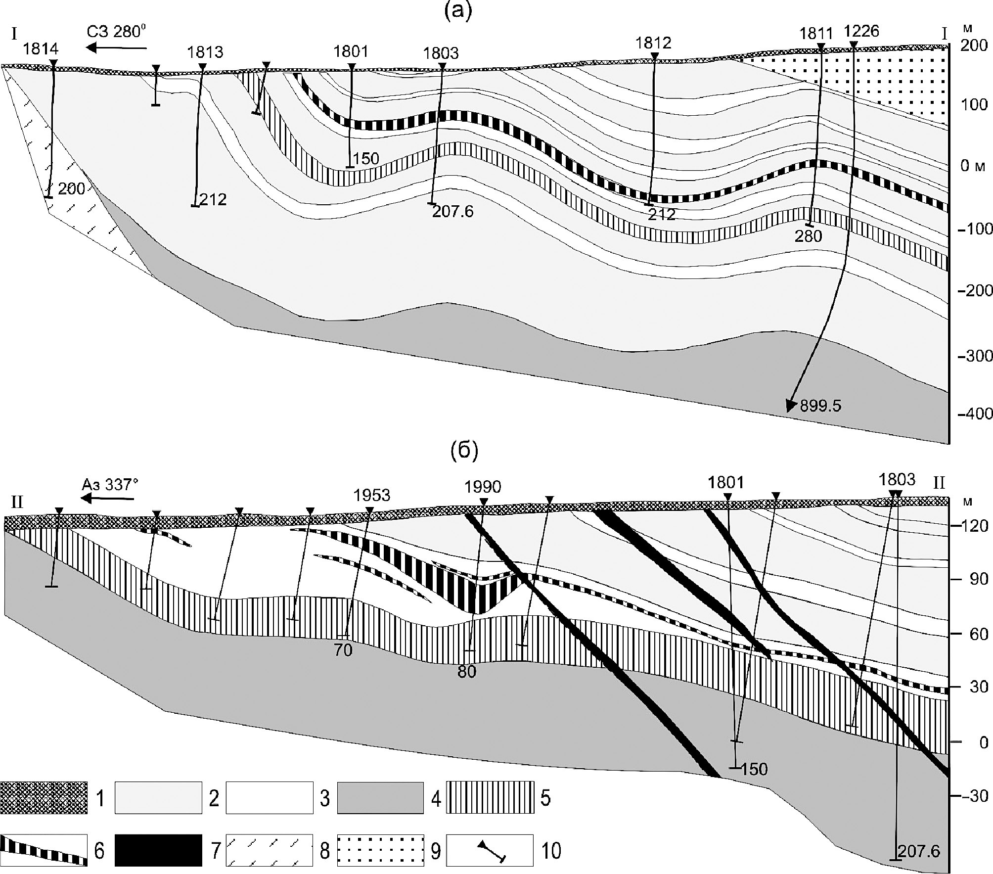 Фиг. 2. Схематические геологические разрезы интрузии Вуручуайвенч: а – по Гроховская и др., 2003, с изменениями, б – по Иванченко и др., 2008ф, с упрощениями. 1 – четвертичные отложения, 2 – лейкократовый и мезократовый габбронорит, 3 – пятнистый анортозит и лейкократовый габбронорит, 4 – мезократовый и меланократовый габбронорит и норит, 5 – такситовый лейкократовый габбронорит; 6 – ЭПГ риф; 7 – дайки габбро-долеритов, 8 – архейские диорито-гнейсы, 9 – вулканогенно-осадочные породы серии Имандра-Варзуга, 10 – расположение скважин.