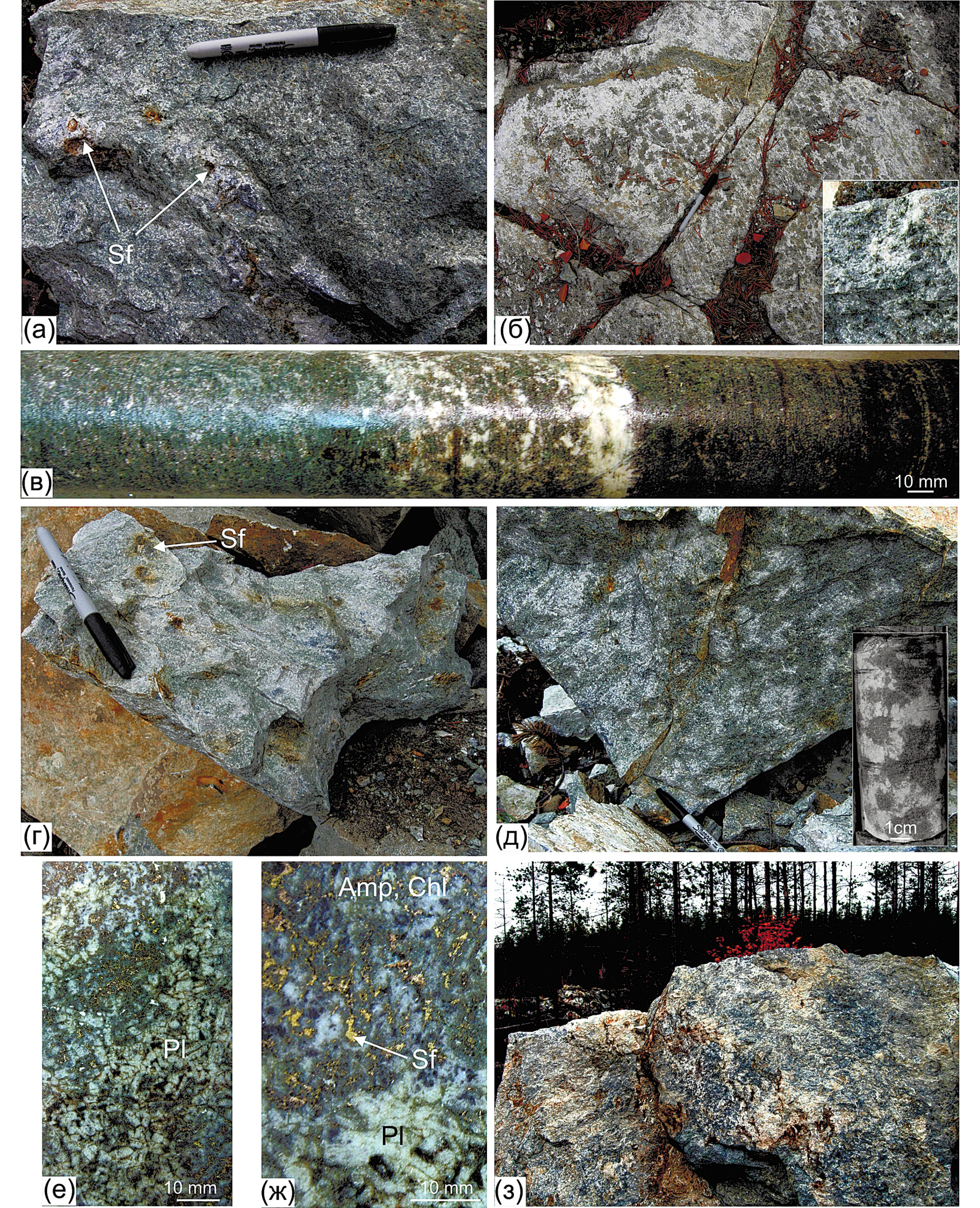Фиг. 3. Фотографии пород ИВ из коренных обнажений, разведочных канав и керна скважин: а – контакт лейкократового габбронорита с мезократовым габброноритом, Sf –сульфиды; б – пятнистый анортозит с пойкилитовыми включениями амфиболизированного пироксена, на врезке – образец скола; в – чередование мезо- меланократового и лейкократового габбронорита (скв. 1990/61); г – анортозит с сульфидной вкрапленностью; д – пятнистый (mottled) лейкократовый габбронорит, на врезке – пятнистый анортозит, надрудный горизонт в скв. 1990); е, ж – образцы керна пятнистого анортозита (1990/51.8) с кластерами первичного плагиоклаза (Pl), в интеркумулусе – амфиболы (Amp), хлорит (Chl) и сульфиды; з – глыбы неравномерно-зернистого лейкократового габбронорита такситовой текстуры.