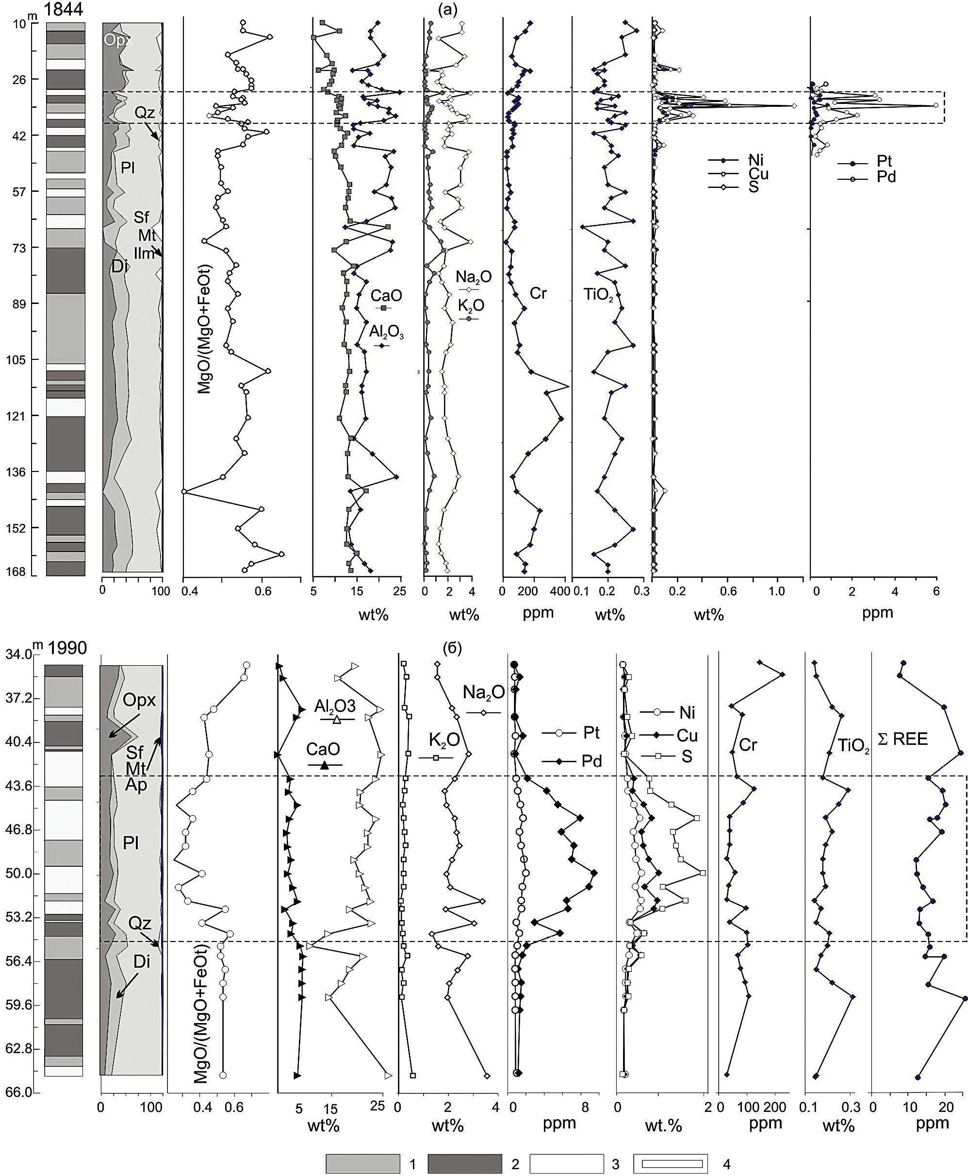 Фиг. 4. Стратиграфические колонки, нормативный состав (CIPW) и вариации петрогенных, редких и редкоземельных элементов в разрезах скважин 1844 (а) и 1990 (б); 1 – лейкократовый габбронорит, 2 – мезократовый габбронорит, 3 – пятнистый анортозит и такситовый лейкократовый габбронорит, 4 – границы развития ЭПГ рифа. Opx –ортопироксен, Pl – плагиоклаз, Di – диопсид, Qz – кварц, Sf – сульфиды; Mt, Ilm – магнетит, ильменит, Ар – апатит.