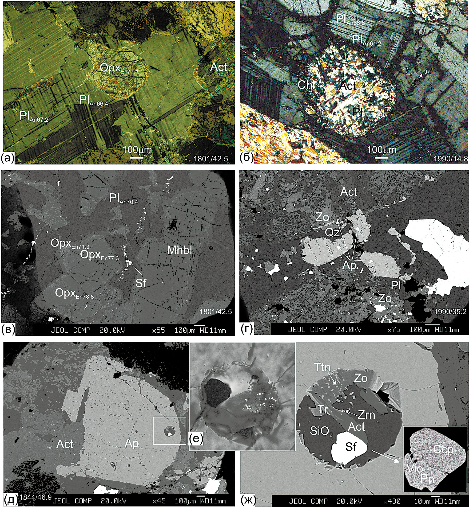 Фиг. 5. Породообразующие и рудные минералы в породах расслоенной зоны ИВ: а – среднезернистый мезократовый габбронорит – ортопироксен (Opx) частично, а авгит полностью замещены актинолитом (Act); б – пойкилитовый анортозит, в интеркумулусе – актинолит и хлорит с хадакристами плагиоклаза; в – мезократовый габбронорит выше ЭПГ рифа: ортопироксен, магнезиальная роговая обманка (Mhbl) и плагиоклаз частично замещены актинолитом и хлоритом; г – кварцсодержащий габбронорит с зернами апатита (Ap), Qz – кварц, белое – сульфиды, ЭПГ риф; д, е, ж – апатит с палеовключением кварца, циркона (Zrn), титанита (Ttn), тремолита (Tr) и актинолита с вкрапленником халькопирита (Ccp), пентландита (Pn) и виоларита (Vio); а, б, е –микрофотографии в проходящем свете в скрещенных николях, в–д, ж – изображения сканирования в обратно-рассеянных электронах, JXA 8200, ИГЕМ РАН.