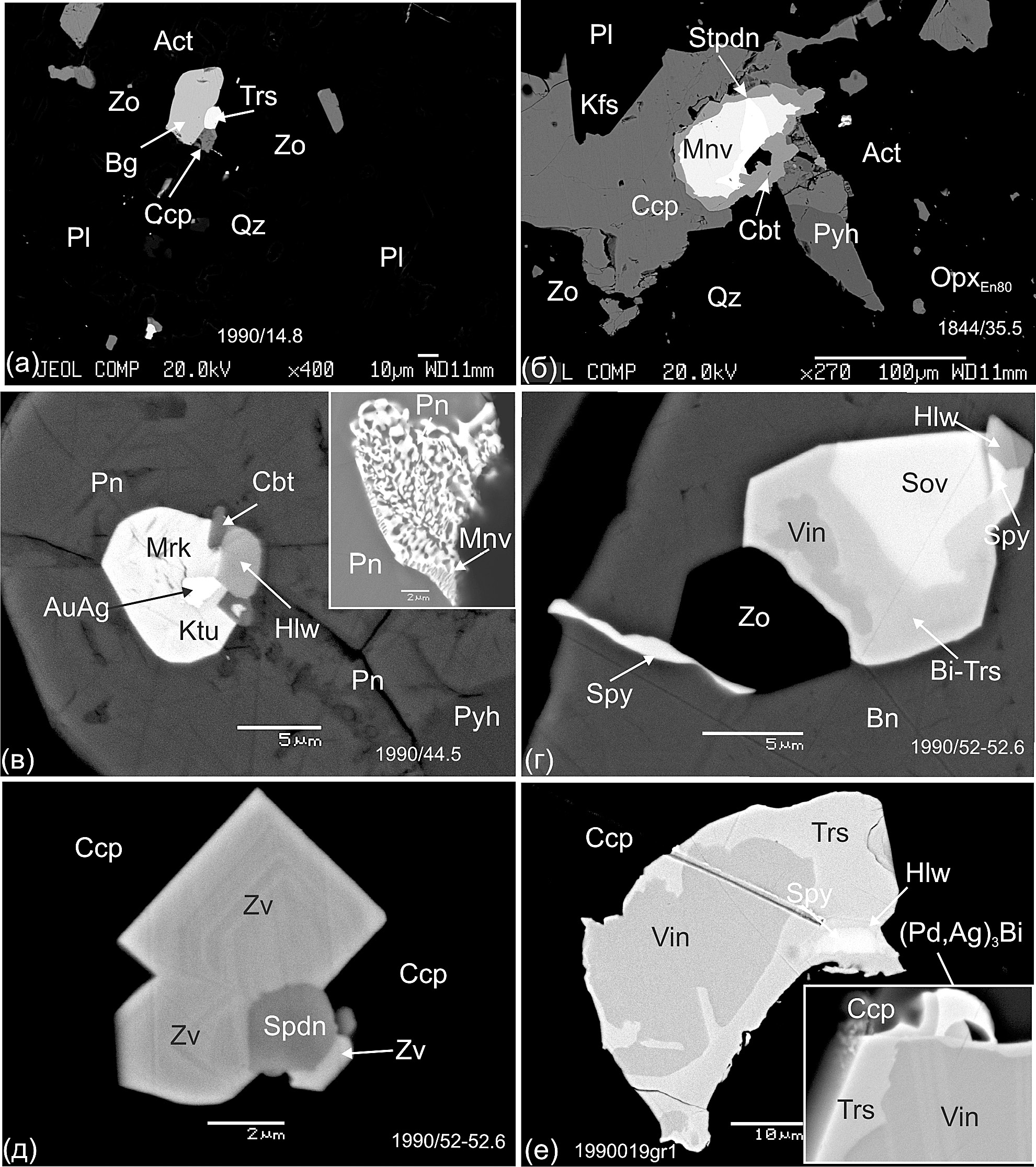 Минералы золота и серебра. Самородное золото и AuAg сплавы образуют мелкие зерна и полиминеральные срастания с МПГ в сульфидах и на контакте их с силикатами (фиг. 10в, фиг. 11а, г, з). Содержания Au и Ag варьируют в широких пределах, основными примесями являются Pd, Cu и Hg. Гессит встречается в срастаниях с Pd-висмутотеллуридами, науманнит очень редок и образует субмикронные включения в халькопирите. Самородное серебро выделяется в виде многочисленных мелких включений и зерен размером 10-40 mм в борните, миллерите и халькопирите (фиг. 12г).
