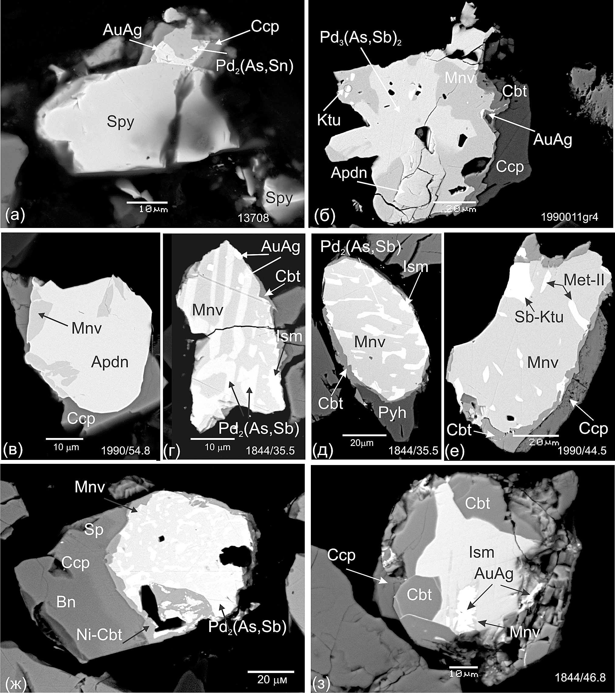 Меньшиковит Ni3Pd2As3 образует отдельные зерна, симплектиты с пентландитом (фиг. 10в, врезка) и полиминеральные сферические срастания округлой, каплевидной формы, которые имеют практически постоянный набор МПГ. Срастания локализованы в халькопирите или на контакте его с миллеритом, пентландитом, борнитом, сфалеритом, пиритом и породообразующими силикатами (фиг. 10б). Основа таких срастаний представлена меньшиковитом, в матрице которого отмечаются лейсты, пластинки и сростки арсенидов и стибиоарсенидов палладия (фиг. 11б–з). В некоторых срастаниях меньшиковит преобладает, в других он почти полностью сменяется арсенидами палладия (фиг. 11в, 11з). В основе одного из срастаний, кроме меньшиковита, найден никелин (Гроховская и др., 2003, фиг. 8c).