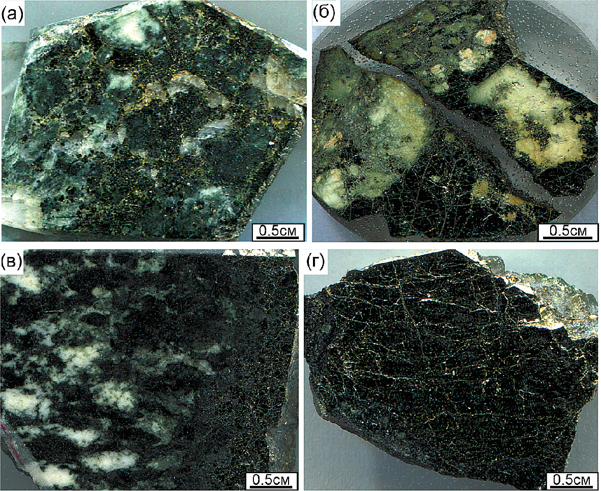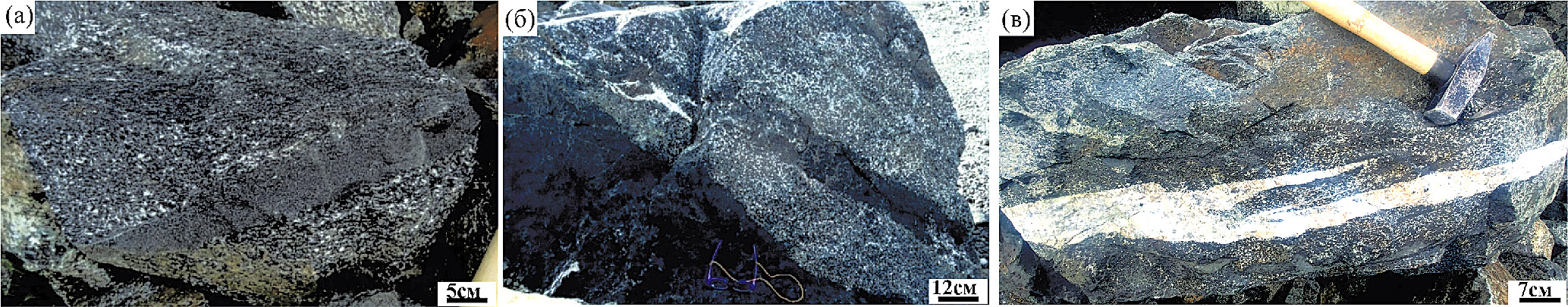 Фиг. 5. Габброиды Василиновского рудопроявления с такситовой текстурой (а, б) пересекаются жилой пироксенита и содержат субсогласные разветвленные жилки плагиоклазитов (в).