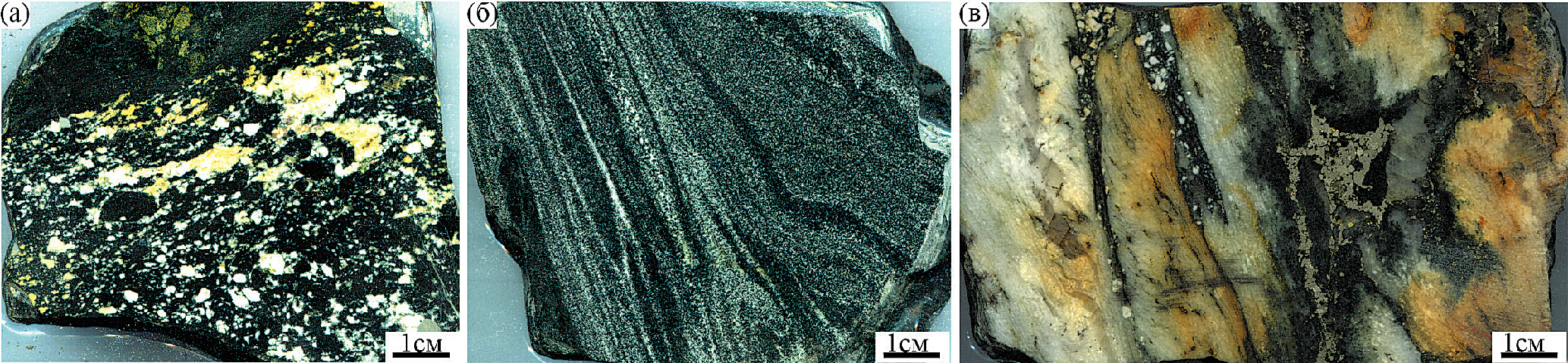 Фиг. 6. Метагабброиды рудопроявления Василиновское: а – амфиболизированное габбро (обр. 18-99); б – гнейсо-амфиболиты (обр. 19-1029); в – кварц-полевошпатовый линейный штокверк с сульфидной минерализацией в амфиболитах (обр. 19-805).