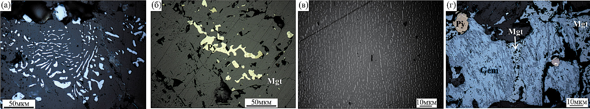 Фиг. 8. Особенности строения и состава агрегатов гематит-магнетитовой ассоциации рудопроявления Василиновское: а – мирмекиты магнетита в амфиболовой матрице амфиболита (обр. А17-10); б – графическое выделение пирита в магнетите (обр. А-121); в – структуры распада магнетит + ильменит в магнетитовом агрегате (обр. 1324); г – гематит-магнетитовый агрегат (обр. А-653).