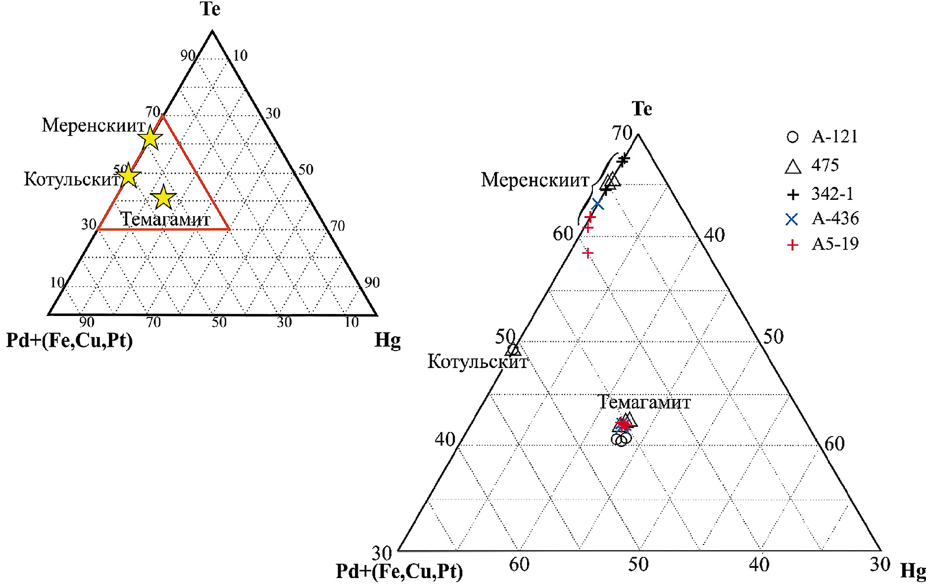 4 | Темагамит | А5-191 | 0.0 | 1.7 | 1.6 | 34.6 | 42.0 | 0.0 | 21.3 | 101.2 | Pd2.79Hg0.91Fe0.26Cu0.21Te2.82 | ||