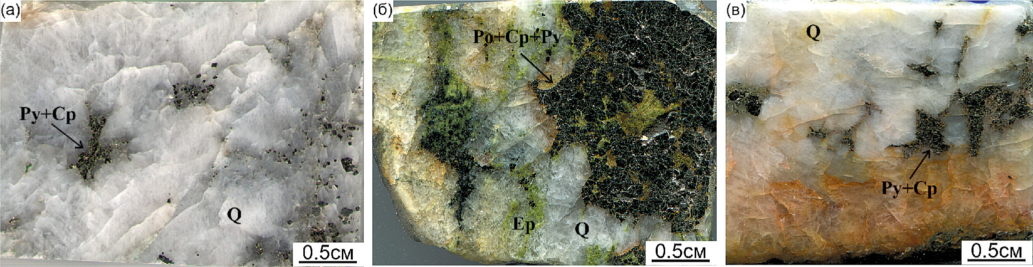 В изложении дальнейшего материала акцентированное внимание будет уделено рудным минеральным ассоциациям. При картировании карьера, последующем описании штуфных образцов и микроскопических исследованиях были выделены, от ранних к поздним, гематит-магнетитовая, магнетит-халькопирит-пиритовая, полисульфидно-полевошпат-кварцевая и полисульфидно-карбонатно-кварцевая рудные ассоциации.