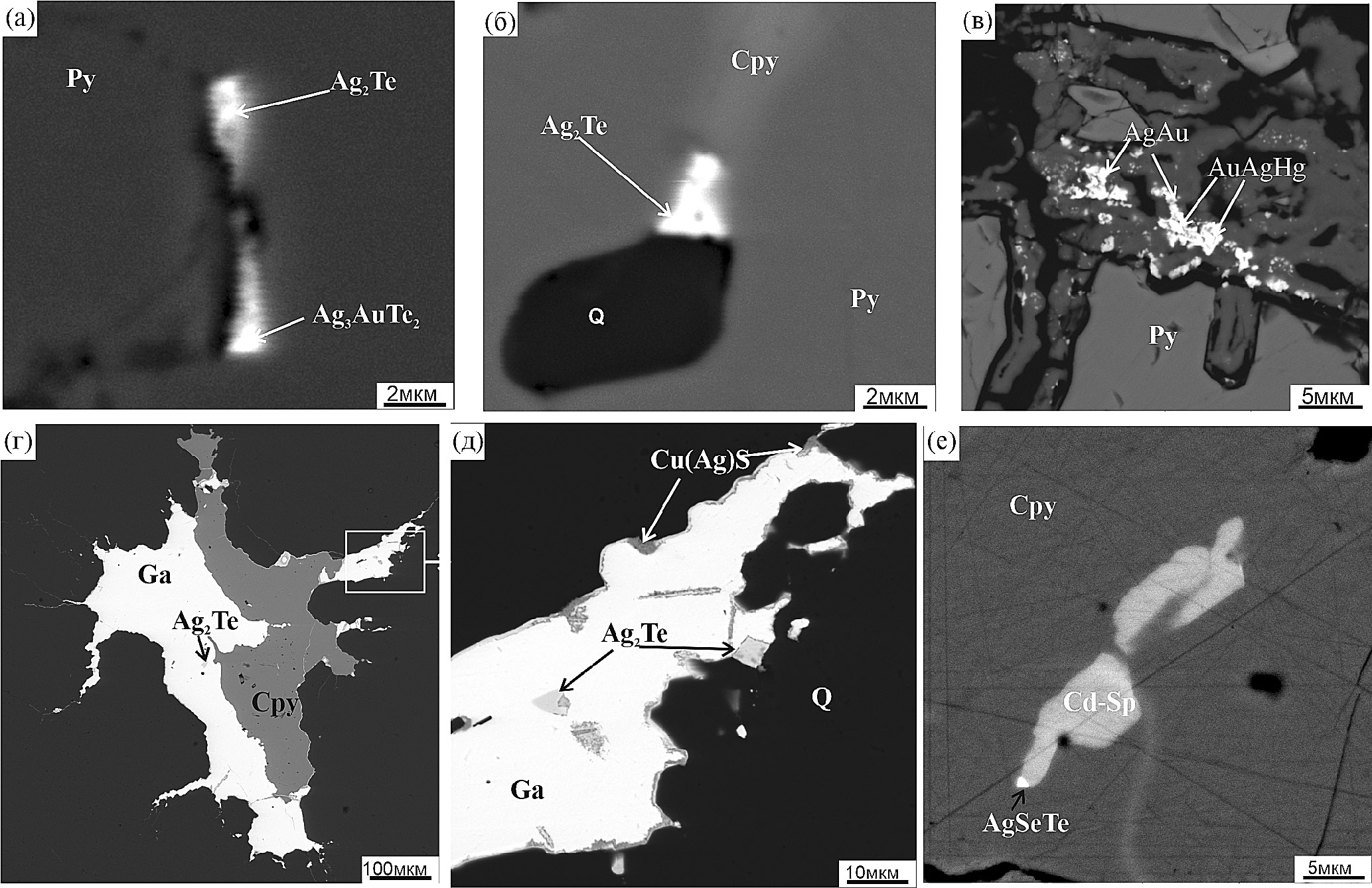 Фиг. 10. Строение сульфидных агрегатов магнетит-халькопирит-пиритовой ассоциации: а – игольчатые агрегаты гематита цементируют изометричные кристаллы магнетита (обр. 475); б – микровключения меренскиита (PdTe 2 ) в пирите ассоциации (обр. 475); в, г – структуры распада: в – линейно-зональные – халькопирит в пирите (обр. А5-19); г – графические срастания – пирит в халькопирите (обр. А-653, воздушное травление); д, е – кокардовые структуры: д – Py+Mgt (обр. 342-1), е – Cp+Py+Mgt (А-652).