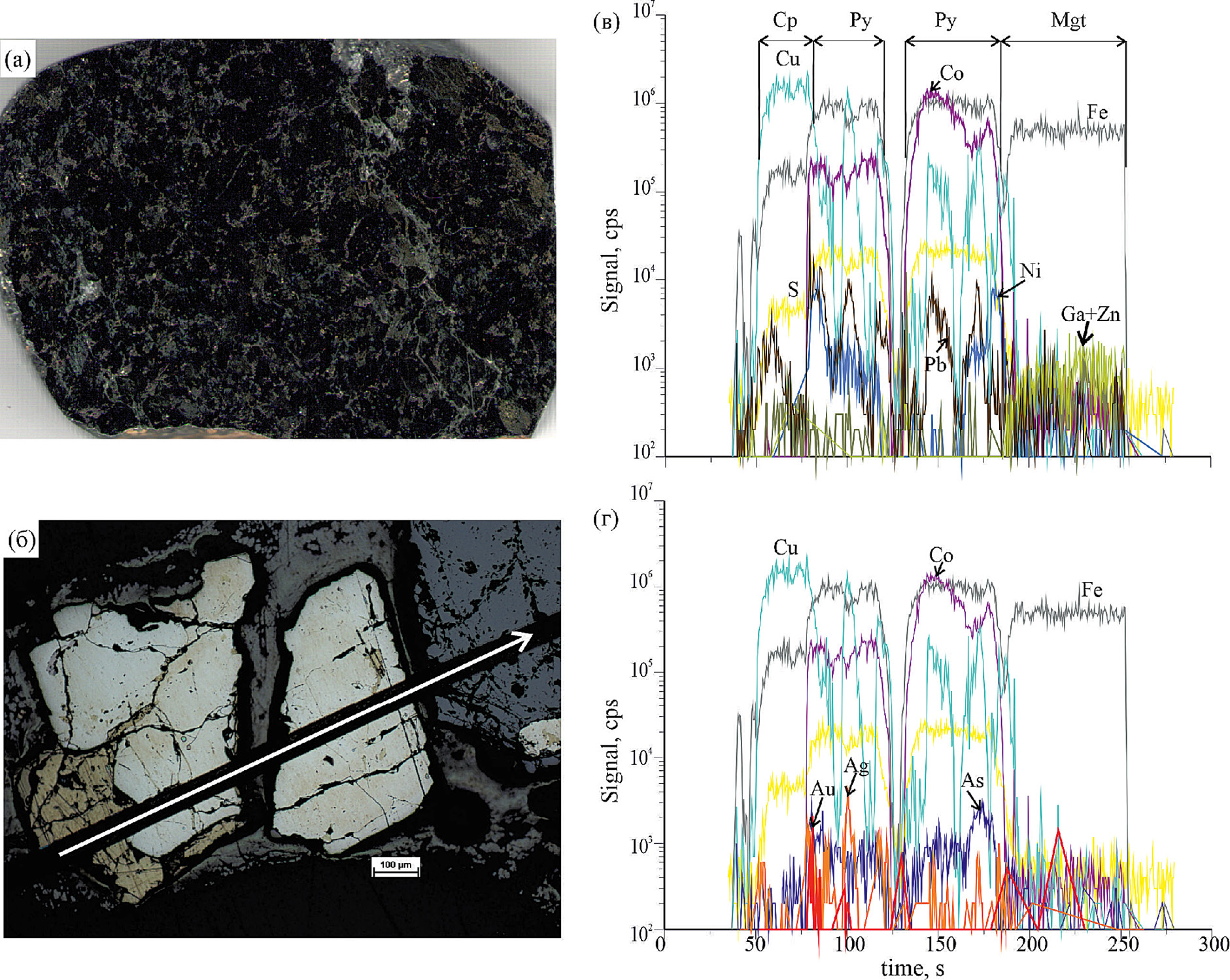 Фиг. 16. Магнетит-халькопирит-пиритовая ассоциация в метагаббро Василиновского проявления: пирит-магнетитовая (с подчиненным халькопиритом) вкрапленность с обилием кобальта в пирите. Макро- (а) и микро- (б) фотографии, на (б) – показана линия лазерного прожига; в, г – распределение элементов-примесей в минералах (последовательно пройдены халькопирит→пирит (с участком, обогащенным Co)→магнетит (обр. А-342). Характерно зональное распределение кобальта, вплоть до появления существенно кобальтовых зон. Примесные элементы (Au, Ni, Pb и др.) преимущественно тяготеют к пограничным зонам минералов.
