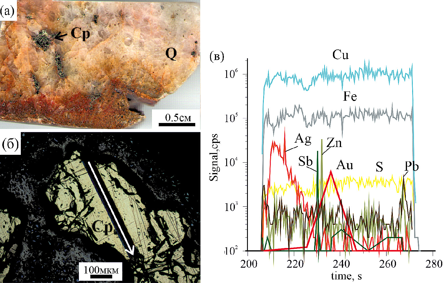 Фиг. 20. Распределение элементов-примесей в халькопирите полисульфидно-карбонатно-кварцевой ассоциации Василиновского рудопроявления. а – сульфидно-кварцевая жила; б – профиль лазера; в – распределение элементов по профилю (обр. А17-01). Высокая корреляционная зависимость (0.8) только между Cu и In, остальные всплески – минеральные включения. Усредненные содержания составляют: Au = 0.23 ppm, Ag = 8.32 ppm, In = 10.8 ppm, Se = 291 ppm.