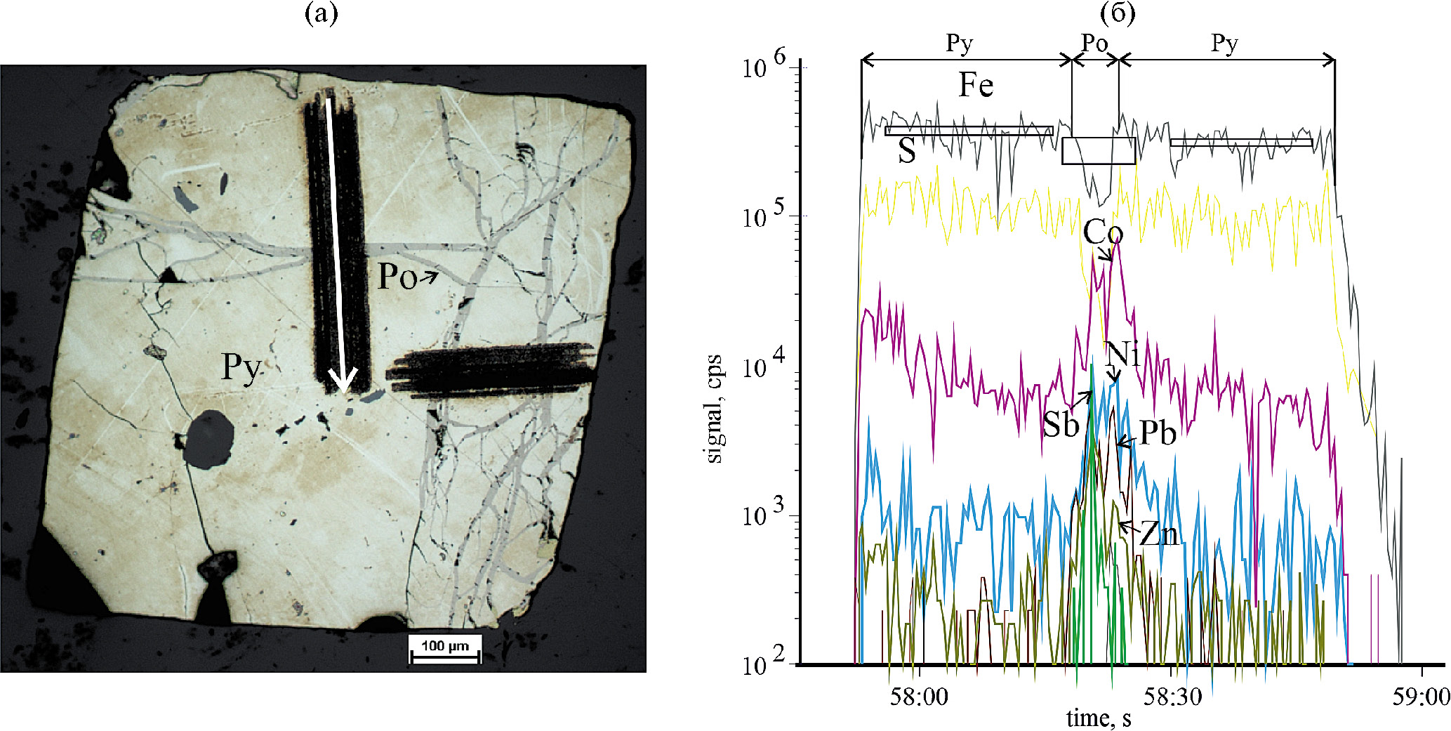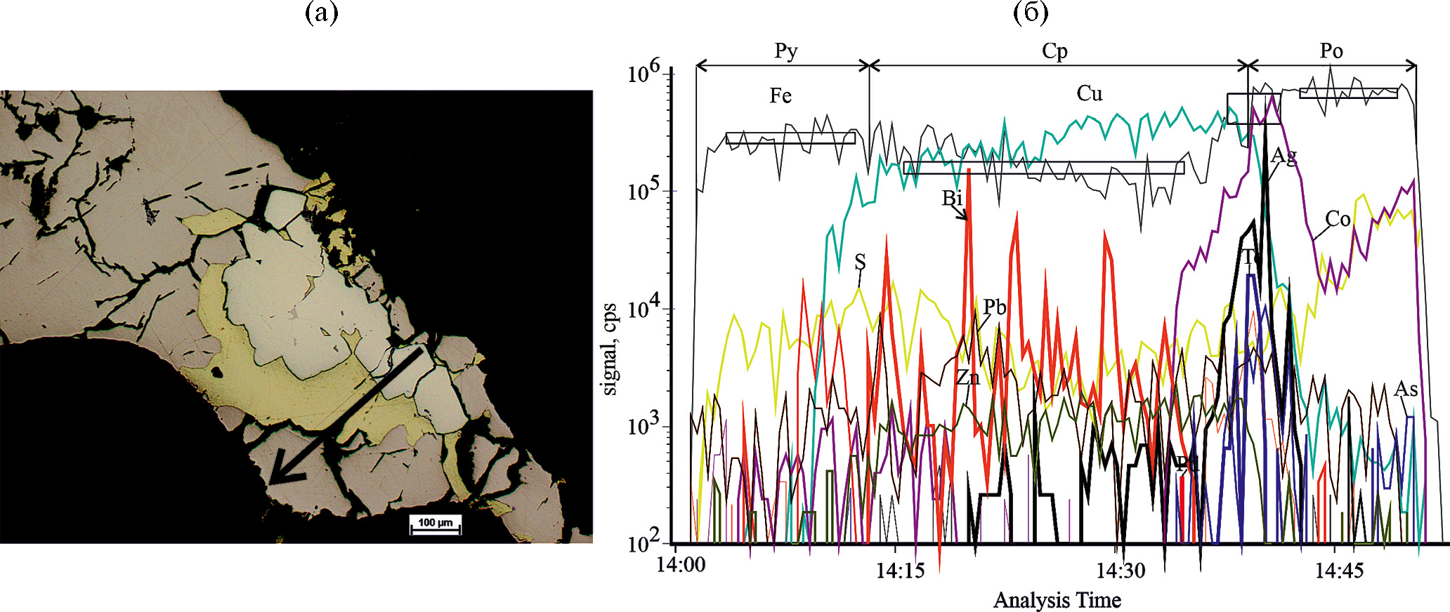 Фиг. 26. Замещение пирита халькопирит-пирротиновым зональным агрегатом. Профиль через три минерала показывает, что в пирите – минимальное содержание (кроме Co и Ni) и разнообразие примесей: Co = 17.8 ppm, Ni = 23 ppm, Bi = 4.8 ppm, Ga = 2.3 ppm, Ag = 0.25 ppm, Te = 2.5 ppm; в халькопирите: Co = 7.9 ppm, Bi = 11.3 ppm, Ga = 14.9 ppm, Ag = 8.8 ppm, Te = 1.6 ppm; контакт халькопирита и пирротина характеризуется максимальными содержаниями Co = 1187 ppm, As = 35 ppm, Ag = 97.4 ppm, Te = 22.2 ppm, Au = 0.7 ppm; в пирротине Co = 350 ppm, Ag = 1.3 ppm, Te = 5.6 ppm, Au = 0.3 ppm (обр. А3-22-1).