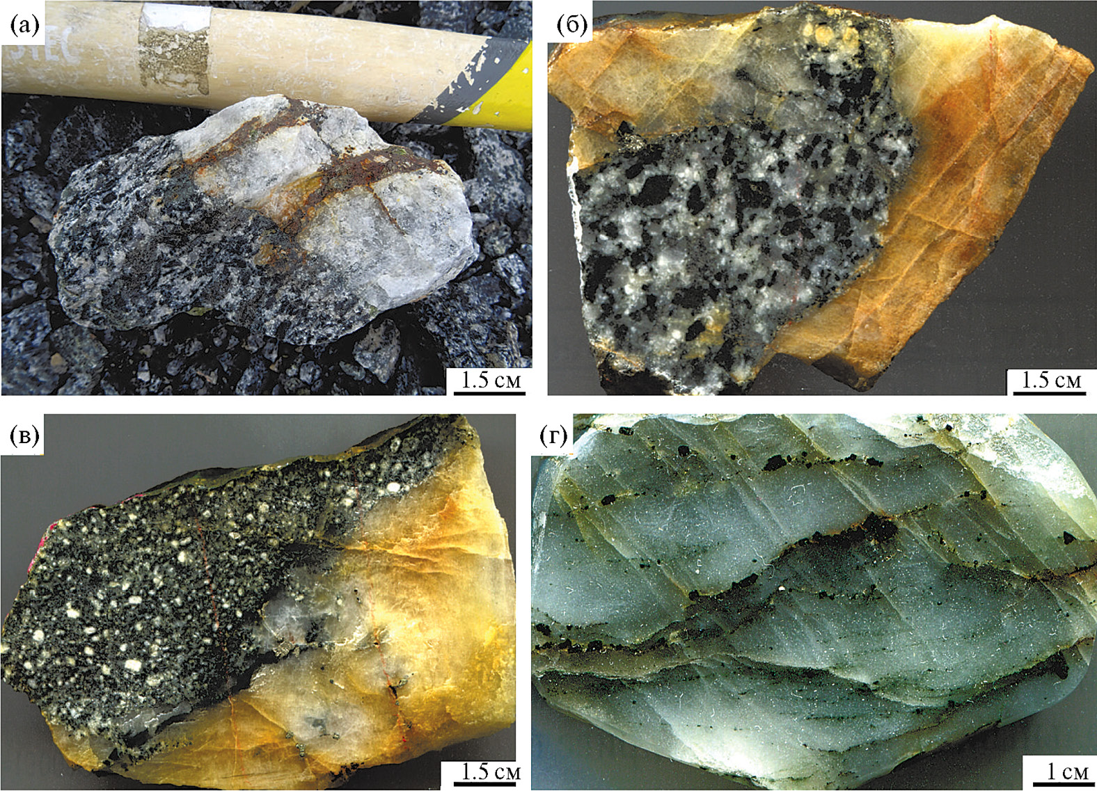 Фиг. 23. Типы гидротермальных образований участка Подгорненский и их взаимоотношения с магматическими образованиями. а – разгнейсованные габброиды пересекаются кварцевой жилой (5 см), которая, в свою очередь, вкрест простирания пересечена субпараллельными сульфидными прожилками; б – фрагмент габброидов цементируется ожелезненным кварцем (обр. А3-4-19); в – поздняя порфировидная дайка пересекается кварцем (обр. А3-11-19); г – фрагмент жилы халцедоновидного кварца с линейной сульфидной вкрапленностью (обр. А3-12-19).