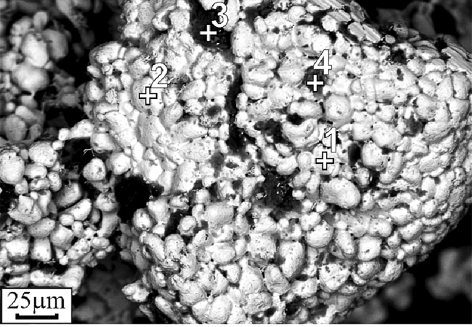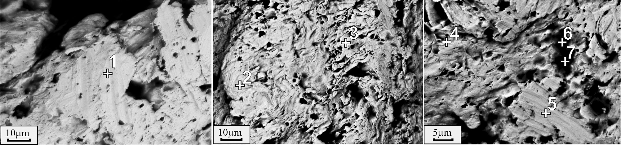 Иногда тонкопластинчатые образования представляют собой химически чистое золото – 1000‰ (фиг. 3, сп. 1–5), с многочисленными кавернами, заполненными высокоуглеродистой алюмосиликатно-железистой минеральной массой (фиг. 3, табл. 2, сп. 6–7).