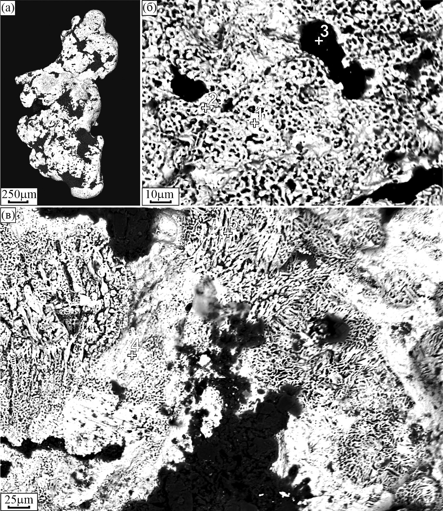 Особенно интересны образцы c ажурной микроструктурой (фиг. 4). Золотина состоит из множества тонких листоватых (фиг. 4в, г, Auпл) и глобулярных выделений, некоторые из которых имеют гипидиоморфный облик (фиг. 4в, г, Auсф). Состав тонкопластинчатых образований отвечает медистому золоту довольно высокой пробы ~ 930–970‰ (табл. 3, сп. 2-7). По периферии этих пленок (фиг. 4в) и на их поверхности (фиг. 4г) установлены многочисленные сфероидальные образования Au (Auсф). Их размер составляет ~ 0.2–1.0 мкм. Есть единичные экземпляры, размеры которых достигают ~ 2–3 мкм. Сфероидные частицы характеризуются более высокой пробой 985–992‰ и не содержат серебра (фиг. 4в, г, табл. 3, сп. 1, 8).