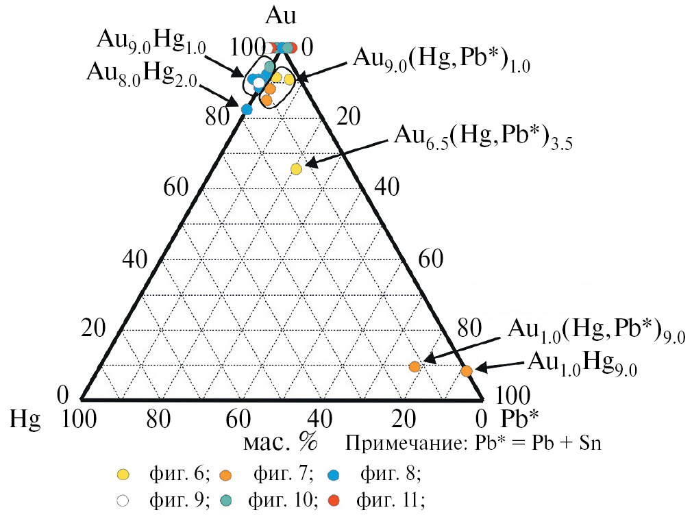 Фиг. 14. Диаграмма составов аутигенного золота техногенных россыпей системы Au-Hg-Pb* (где Pb* = Pb + Sn) (фиг. 6–11, табл. 5). Приведены приближенные формулы составов интерметаллических соединений.