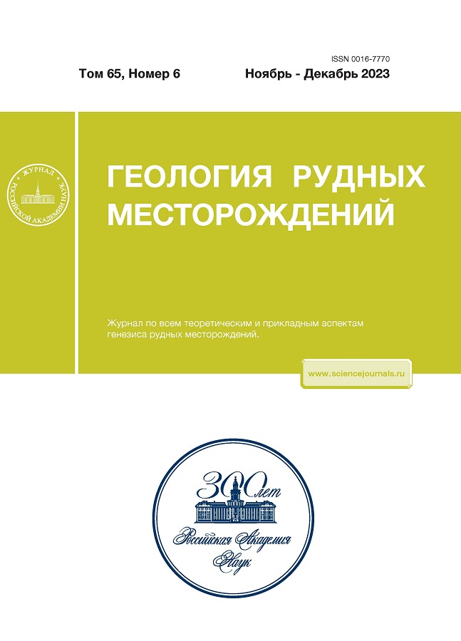 The work presents the first data on sulfide mineralization in carbonate–silicate veins, which are widespread on the islands and coast of the White Sea (North Karelia), associating with Early Proterozoic metamorphosed gabbroid bodies. The veins with Fe–Cu sulfide mineralization up to ore occurrences are localized within metabasite bodies and along their contacts with host gneisses. During the study of the mineral composition of the veins, the main assemblages of sulfide minerals were identified: chalcopyrite –bornite ± chlorite ± selenides and Pb–Ag tellurides (B1); digenite–bornite ± selenides and Pb, Ag, and Pd tellurides (B2); pyrite–bornite ± chalcopyrite (B3); marcasite–pyrite–bornite–chalcopyrite (B4); and siegenite–chalcopyrite ± acanthite ± chlorargyrite. The development of sulfide associations, as well as quartz–chlorite aggregates, was related to the late stage of vein formation. Inductively coupled plasma and laser ablation mass spectrometry analyses showed that bornite from association B1 has the highest silver content (up to 675 ppm) and, in terms of Ag, Se, and Bi contents, is closest to bornite from low-temperature epithermal, skarn, and high-temperature vein deposits. In general, bornite is the main Ag carrier in the studied associations, while digenite containing up to 1000 ppm Ag, as well as discrete silver minerals (selenides, tellurides, acanthite, and chlorargyrite), occur in subordinate quantities. Fluid inclusions in quartz from sulfide associations, as well as from a sulfide-free carbonate–silicate vein, were studied by cryo- and thermometric methods. It is established that mineralization at the late stages of vein formation was related to heterogeneous CO2–H2O–NaCl metamorphic fluid. Carbon dioxide fluid inclusions were captured by vein quartz at temperature of 253–314°C and pressure of 2 ± 1 kbar. Water–salt inclusions were captured in a wider temperature range of 100–500°С. The highest temperature fluid inclusions with temperatures of homogenization >300°С are characteristic of quartz veinlets of the siegenite–chalcopyrite association with Ag sulfide and chlorargyrite.