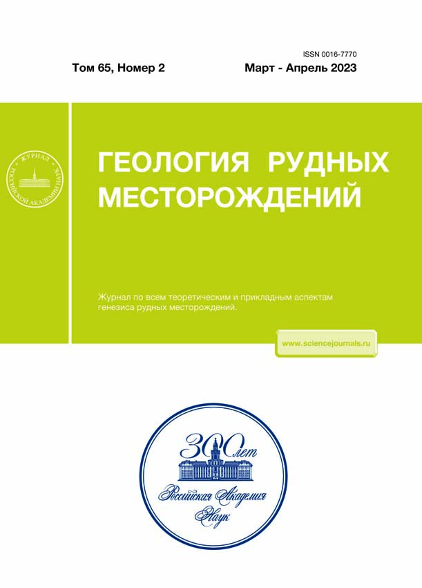 The Birkachan deposit in the Middle Paleozoic Kedonsky Volcanic Belt (KVB) is unique in Northeast Russia for its stockwork epithermal Au–Ag ores. The deposit is located in the northeastern part of the Gurnik volcanotectonic depression, in the Kedonsky segment of the KVB. The deposit is localized in the lying side of a large sublatitudinal thrust fault, due to which it was overlain in the Jurassic–Early Cretaceous by allochthon rocks and, therefore, was slightly eroded, as evidenced by the preserved fragments of the argillisite cap. The ore-bearing Gurnik sequence is composed of felsic tuffs and lavas with intercalations of ignimbrites. The main ore-bearing zone of the Birkachan deposit is 4.5 km long and 200–300 m wide consists of several echelon-like vein zones of northeast strike, falling to the southeast at angles of 55°–70°. Most of the ore bodies are linear stockworks. Single, lenticular rich ore bodies represented by mineralized breccias have been found at deep horizons. In the section, the system of ore bodies of the Birkachan deposit forms a fan-shaped structure. The main textures of ores are vein-disseminated, breccia, and rhythmically banded. The ores are enriched in comparison with the upper continental crust in a rather narrow range of elements (Au, Ag, Sb, As, Mo, W, and Li) and are poor in rare-earth elements, among which light lanthanides predominate. The sulfide grade of ores is 0.1–0.5%. The vein minerals in ores are dominated by quartz, sericite, and siderite. Among the ore minerals, pyrite dominates, with fahlore, native gold and chalcopyrite, and minerals of the series acanthite → Se–acantite → naumannite, pearceite, and Se–pearceite being less common. The average fineness value of native gold is 643‰. The parameters of mineral-forming solutions correspond to typical medium-temperature fluids of epithermal low-sulfidized deposits: homogenization temperature of 93–291°С, salt concentration of 0.2–7.0 wt % eq. NaCl, and fluid density of 0.71–0.99 g/cm3. The main indicators of fluid composition are CO2/CH4 = 15.8–23.6, Na/K = 2.3–4.3, and K/Rb = 2007. The prospects for increasing the reserves of Au and Ag are associated with further study and exploration of the flanks and deep horizons of the deposit.
